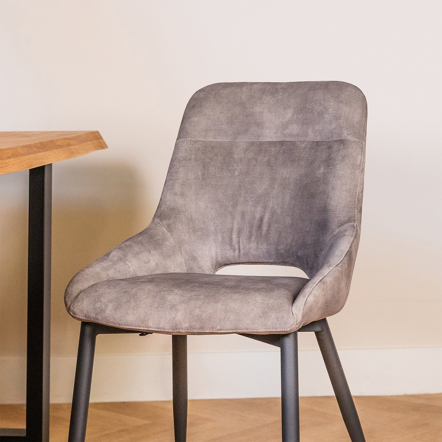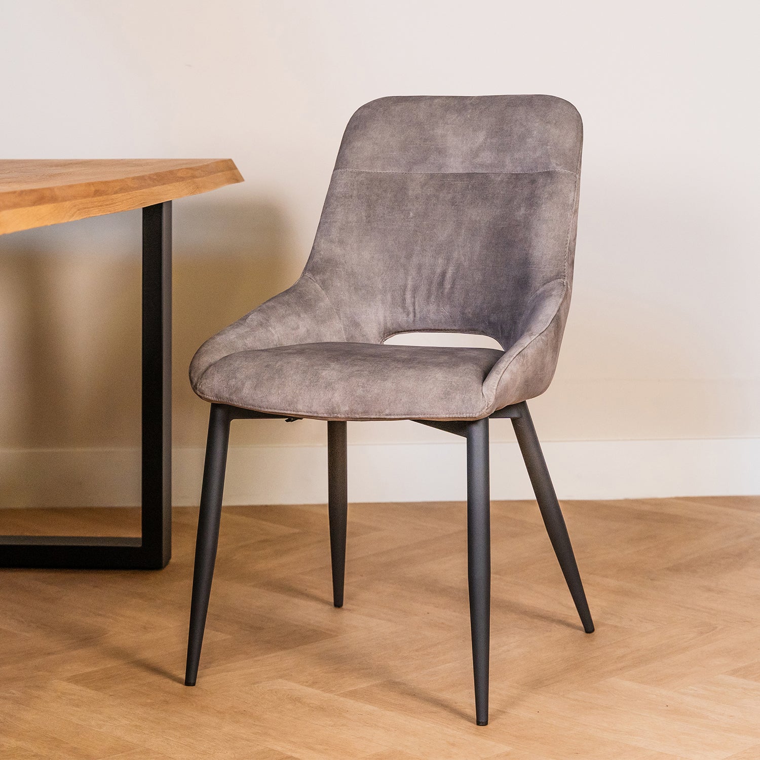 Deze eetkamerstoel krijgt een speels karakter door de velvet stof en door de opening in de rugleuning. Deze opening geeft een chique en unieke uitstraling aan de stoel, wanneer deze aan de eetkamertafel staat. De 4 zwarte metalen poten zorgen ervoor dat deze stoel mooi afsteekt tegen de vloer en de stoel echt opvalt in het interieur.