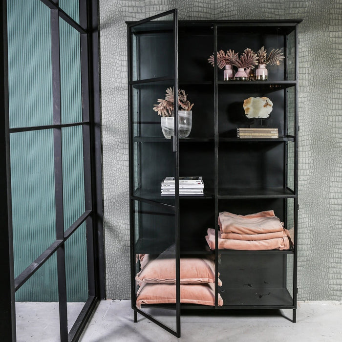 Gemaakt van zwart staal, biedt deze vitrinekast niet alleen een stevige constructie, maar ook een eigentijdse uitstraling. Het is een stijlvolle keuze voor elk interieur, zowel praktisch als decoratief.