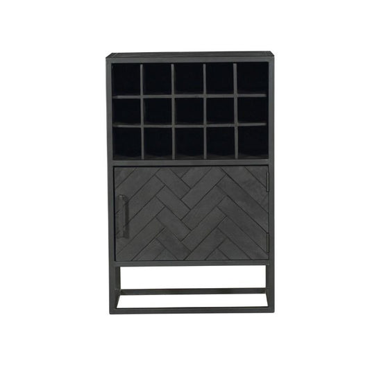 De meeste wijnkasten in ons assortiment zijn gemaakt van massief mangohout, gecombineerd met zwart metaal voor een industriële uitstraling.