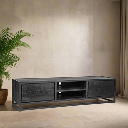 Onze zwarte industriële tv-meubels zijn de perfecte keuze voor het creëren van een stoere, industriële sfeer in je woonkamer. Deze stukken kenmerken zich door het gebruik van robuuste materialen zoals metaal en hout, vaak gecombineerd in een ontwerp dat zowel stijlvol als praktisch is. Een industrieel tv-meubel kan een zwarte metalen onderstel hebben, gecombineerd met houten oppervlakken, of volledig uitgevoerd zijn in matzwart voor een gestroomlijnde look. Dankzij de neutrale kleur is een zwart industrieel tv-meubel eenvoudig te combineren met andere woonaccessoires en meubels.
