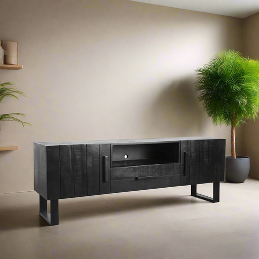 Een tv meubel zwart hout brengt een unieke combinatie van traditionele charme en moderniteit in je woonruimte. Deze meubelstukken zijn vaak vervaardigd uit een mix van natuurlijk hout en metalen elementen, waarbij de zwarte kleur het hout een rijke, diepe toon geeft. Perfect voor liefhebbers van een industriële of landelijke stijl, deze meubels bieden niet alleen een stijlvol platform voor je televisie, maar ook voldoende opbergruimte voor je apparatuur en accessoires. Of je nu kiest voor een volledig zwart model of een met zwarte accenten, een zwart houten tv-meubel is een veelzijdige keuze die moeiteloos opgaat in diverse interieur stijlen. Van strak en modern tot warm en uitnodigend, deze meubels kun je met bijna alles combineren.