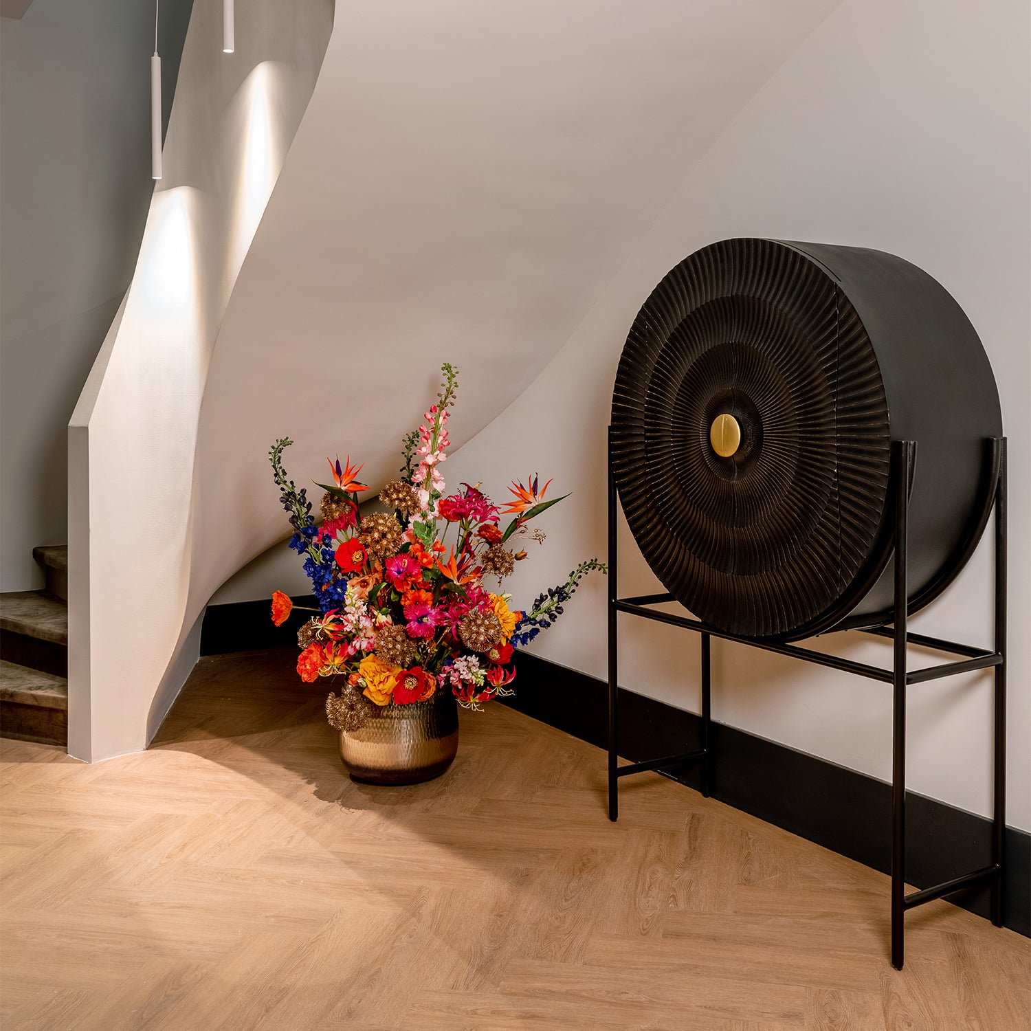 Met afmetingen van 160,0 cm hoog, 102,0 cm breed en 39,0 cm diep biedt Barkast Feda voldoende ruimte en is hij ideaal om neer te zetten in elke ruimte. De combinatie van materialen en het unieke ontwerp maken deze barkast een echte eyecatcher in je interieur.