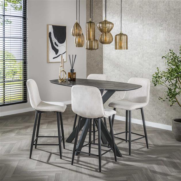 Het zitvlak van de barkruk Amelia is uitgevoerd in polyester ribstof, wat zorgt voor een stijlvolle look en een heerlijk zitcomfort. De fijne ribstructuur geeft de barkruk een luxe uitstraling, terwijl het materiaal ook praktisch en duurzaam is. Of je de kruk nu gebruikt aan een bar, kookeiland of hoge tafel, hij blijft zijn mooie uitstraling behouden.