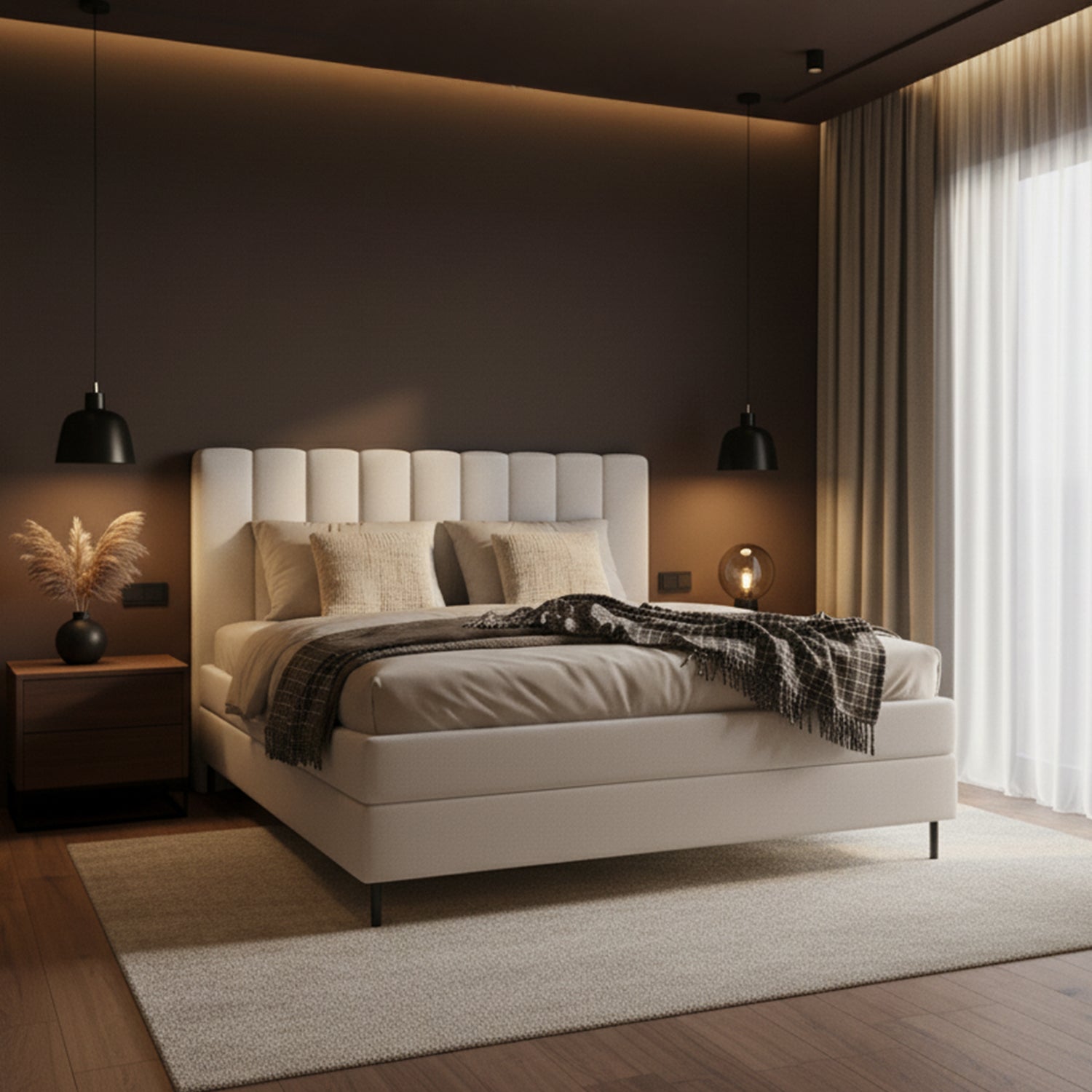 Bed Ella van Meubelbaas Keuze is een prachtig en comfortabel bed dat je slaapkamer een luxe uitstraling geeft. Dit stevige bed heeft een sterk houten frame en een zachte, mooie bekleding, waardoor het er niet alleen goed uitziet, maar ook heerlijk ligt. Het hoge hoofdbord biedt extra steun als je in bed een boek leest of tv kijkt.
