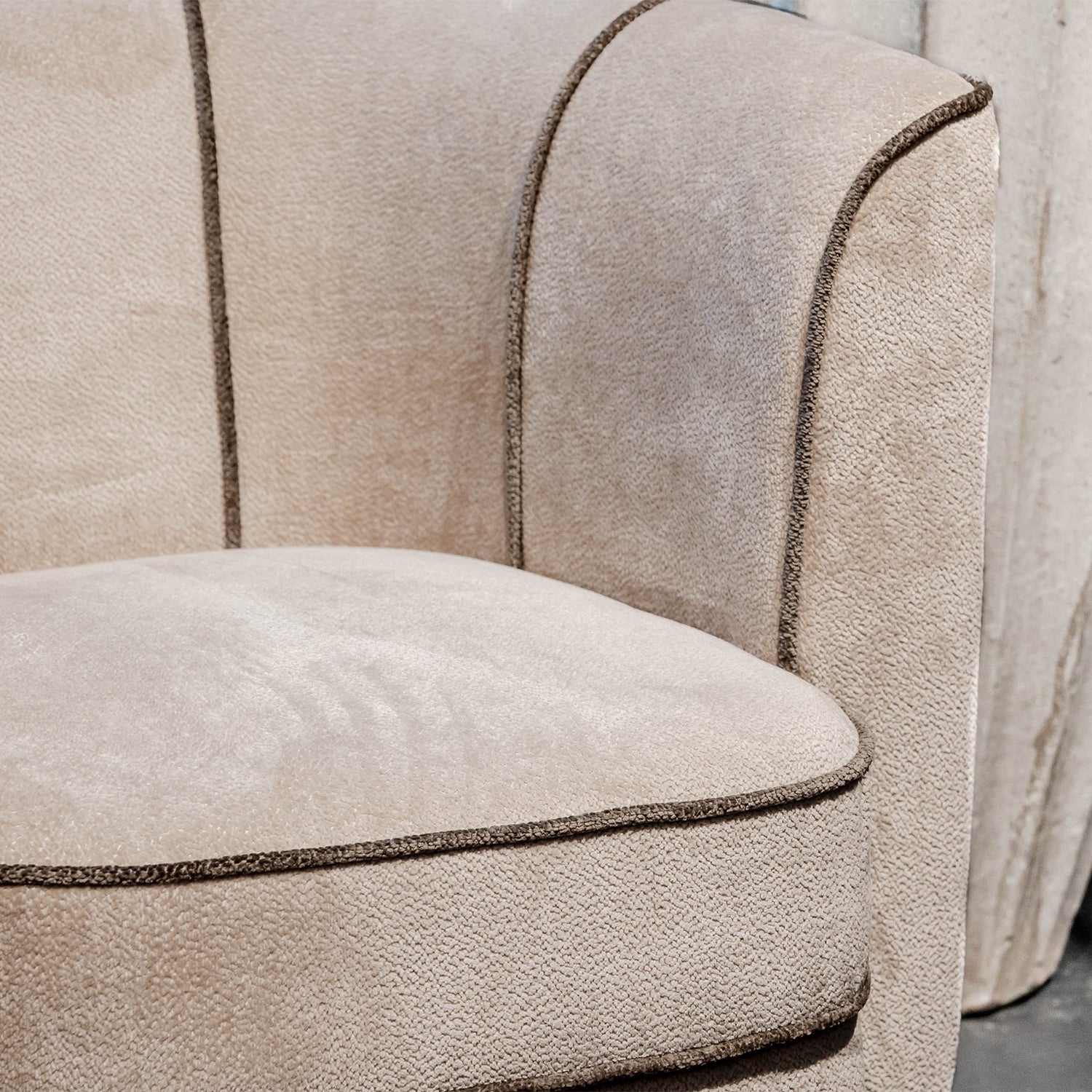 Het kenmerkende ontwerp van de beige fauteuil wordt versterkt door de luxueuze bruine strepen, die een subtiel contrast toevoegen en een gevoel van verfijning brengen. Of je nu geniet van een rustige avond alleen of gasten ontvangt voor een gezellig samenzijn, deze fauteuil biedt een uitnodigende en comfortabele zitervaring.