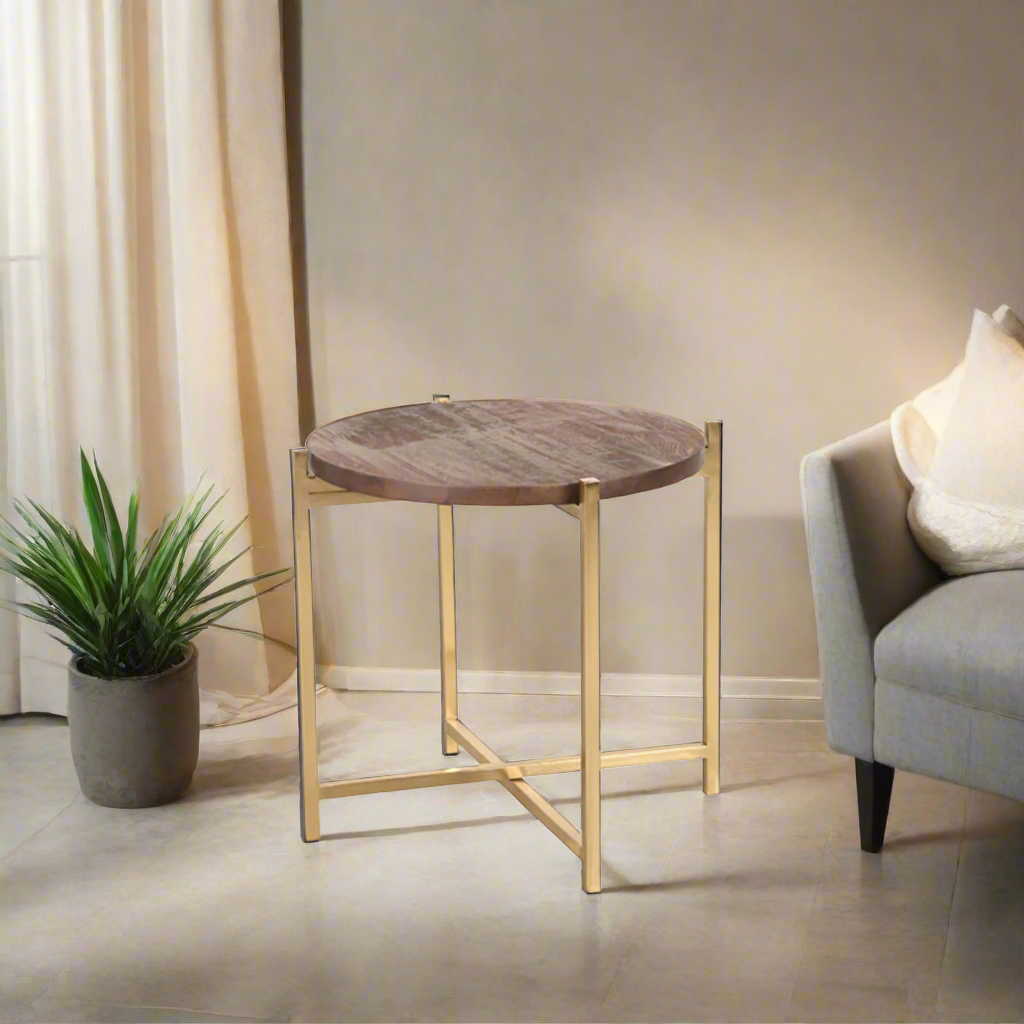 De bijzettafel Dox combineert elegantie en functionaliteit in een compact ontwerp. Het tafelblad, vervaardigd uit duurzaam bruin mangohout, straalt warmte en karakter uit. Het opvallende gouden metalen frame voegt een vleugje luxe toe en zorgt tegelijkertijd voor stabiliteit. Deze tafel past perfect in een modern of industrieel interieur.