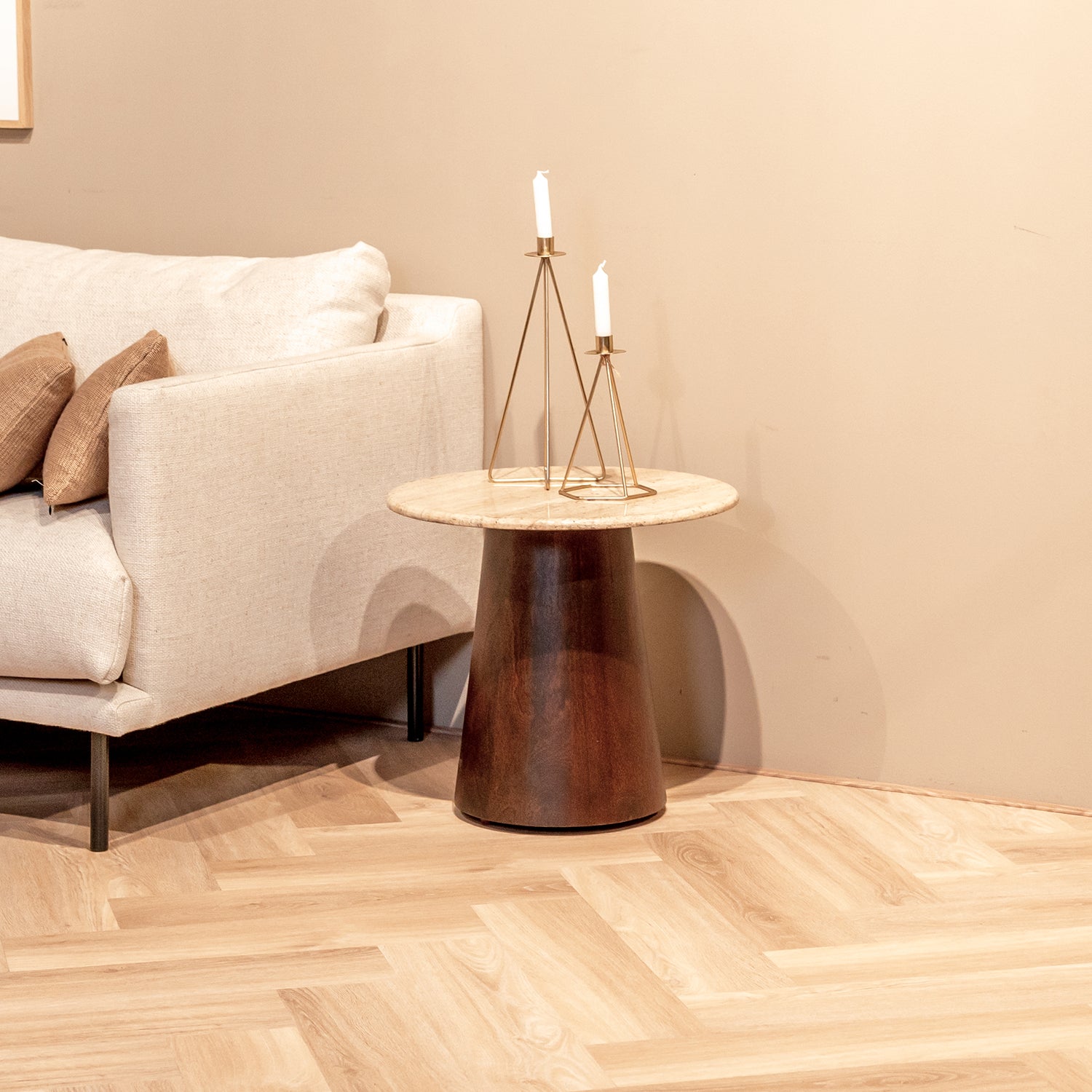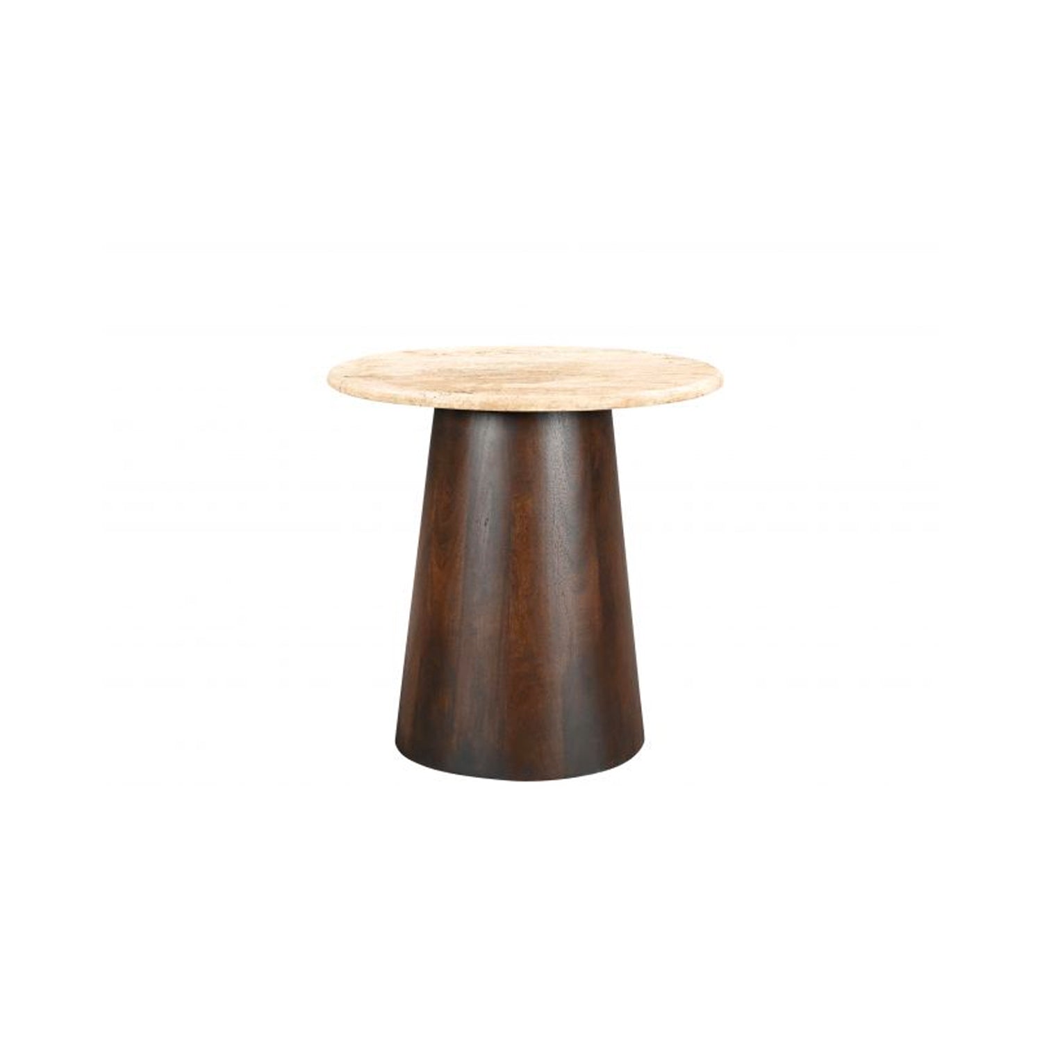 Bijzettafel Valentino is een stoere bijzettafel uitgevoerd in mangohout en een tafelblad van Travertin. Het mooie design van dit hogere ronde tafeltje heeft een mangohouten blad en onderstel, waardoor deze bijzettafel perfect te combineren is in ieder interieur.