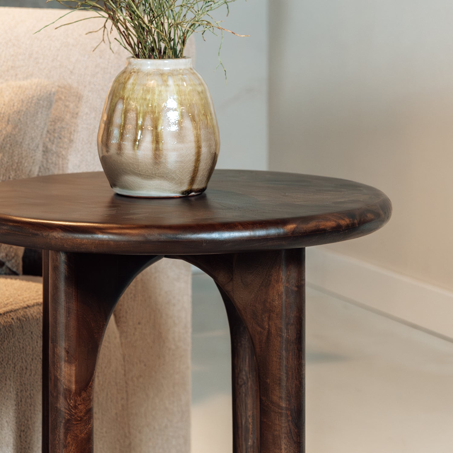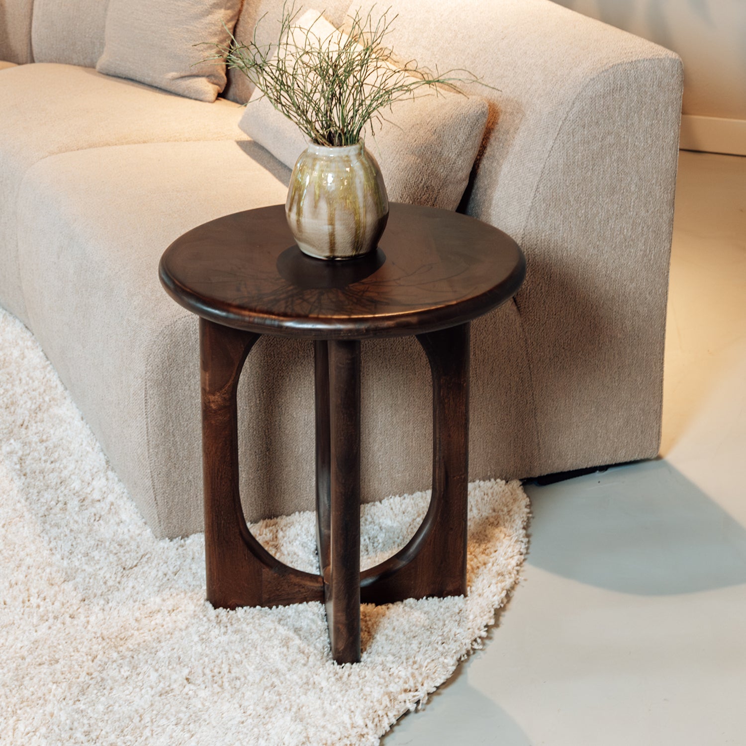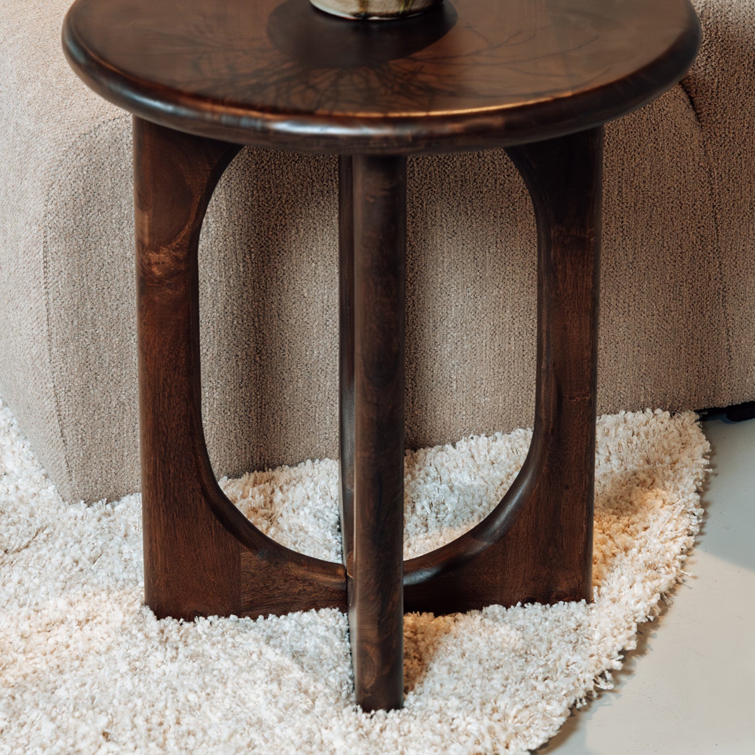 Het natuurlijke mangohout geeft de tafel een warme uitstraling en maakt elk exemplaar uniek door de zichtbare houtnerven. De ronde vorm zorgt voor een speelse, zachte uitstraling die gemakkelijk te combineren is met andere meubelstukken. De compacte maat maakt de bijzettafel ideaal voor kleinere ruimtes zonder concessies te doen aan stijl.