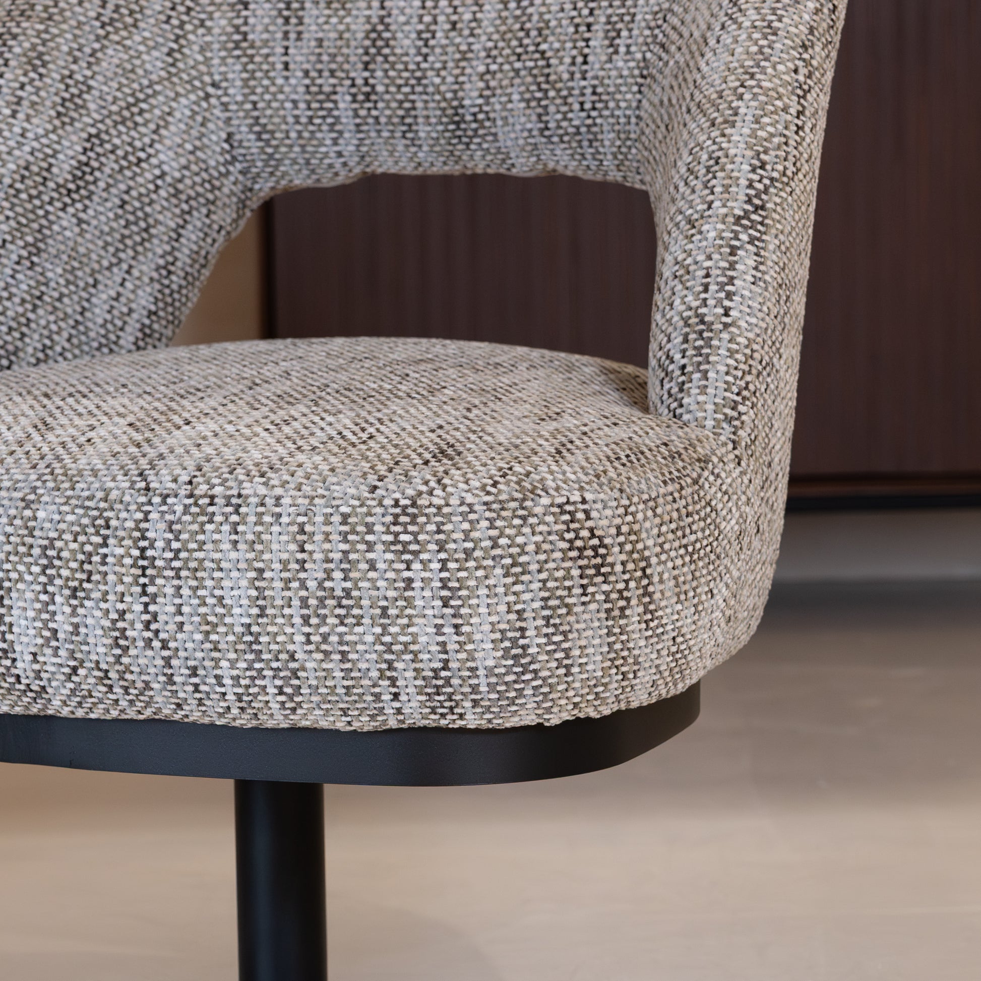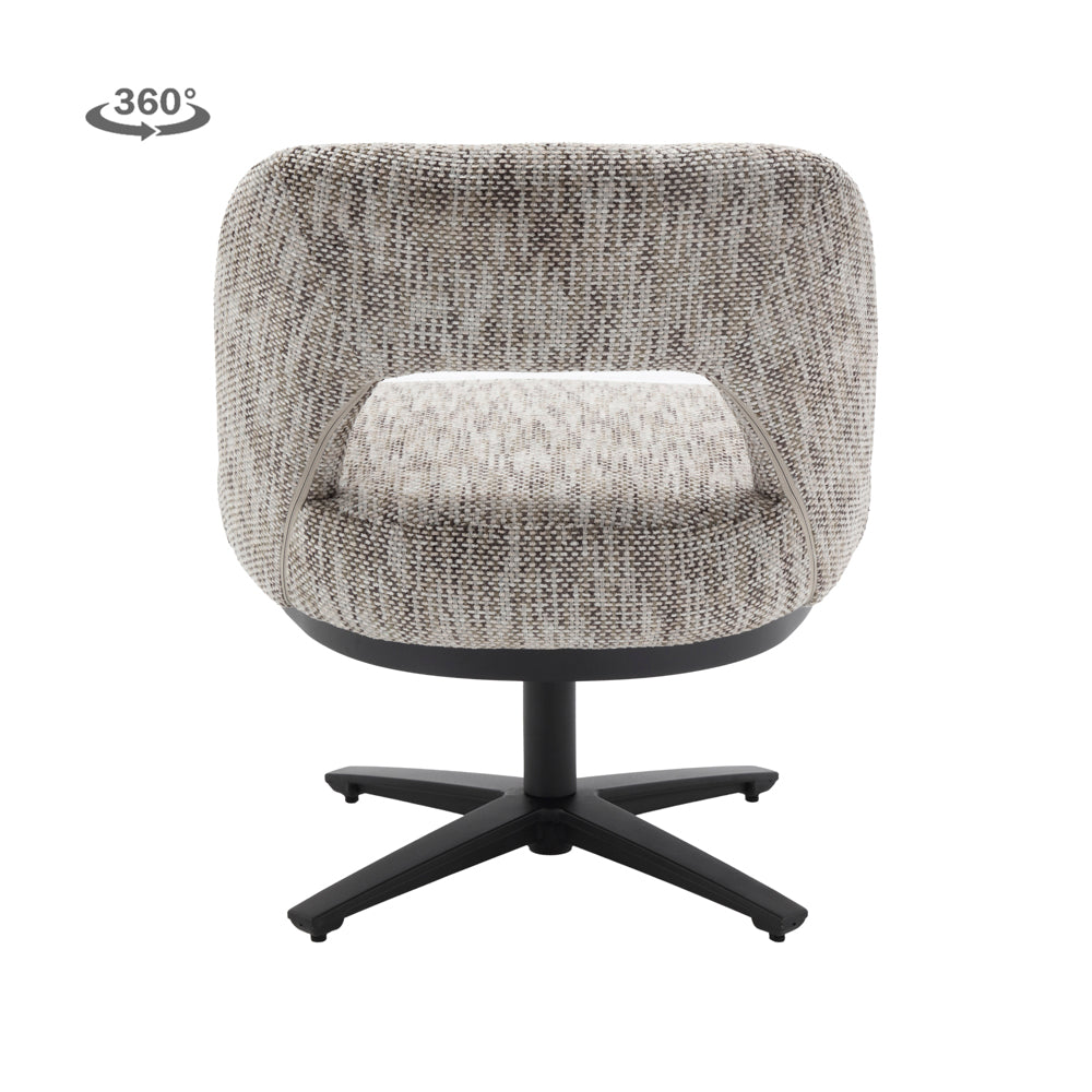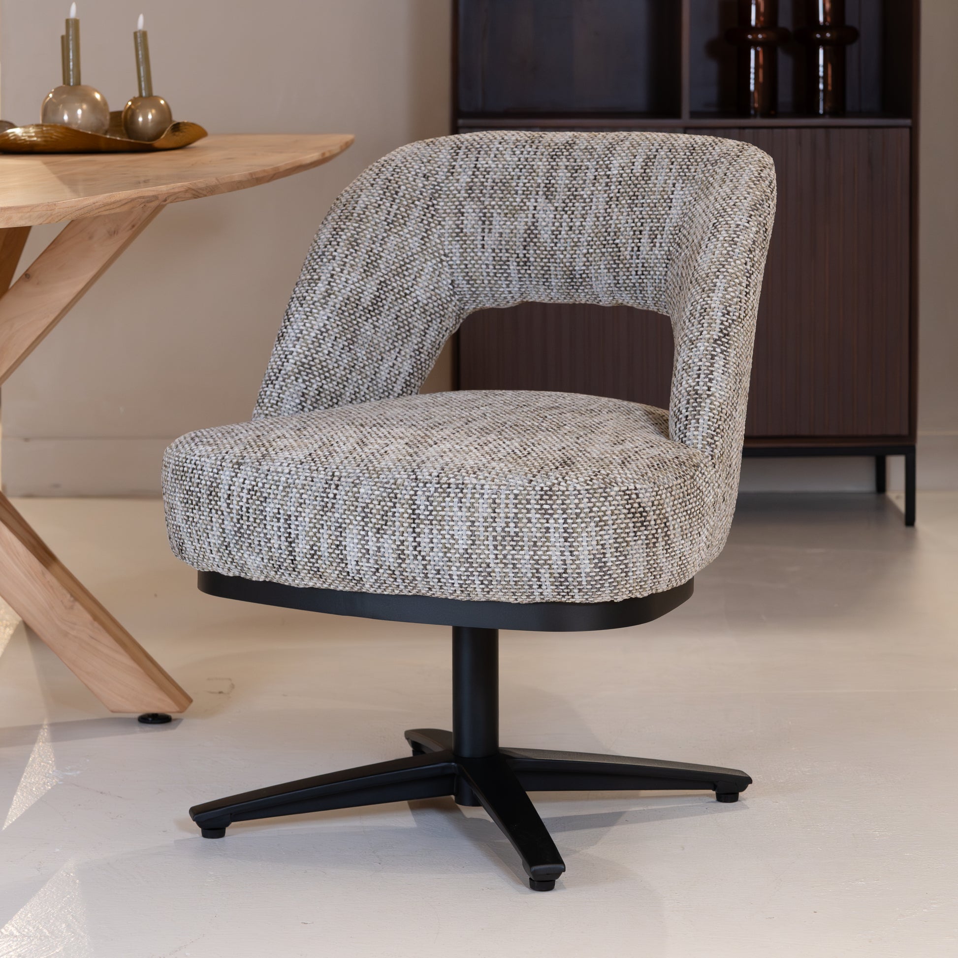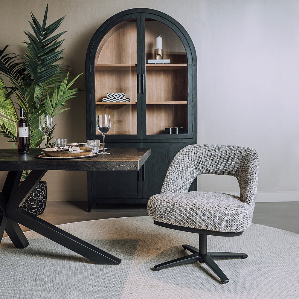 De Caldes Eetkamerstoel | Grijs Stof van Tower Living combineert ultiem zitcomfort met een modern design. Deze stijlvolle draaistoel is bekleed met hoogwaardige stof, die een warme, lichte uitstraling geeft en tegelijkertijd slijtvast en onderhoudsvriendelijk is. De organisch gevormde zitschaal met subtiel geïntegreerde armleuningen biedt optimale ondersteuning en nodigt uit tot lang en ontspannen zitten. Het zwarte metalen onderstel met 360° draaifunctie maakt de stoel niet alleen praktisch, maar ook een speelse toevoeging aan je interieur.