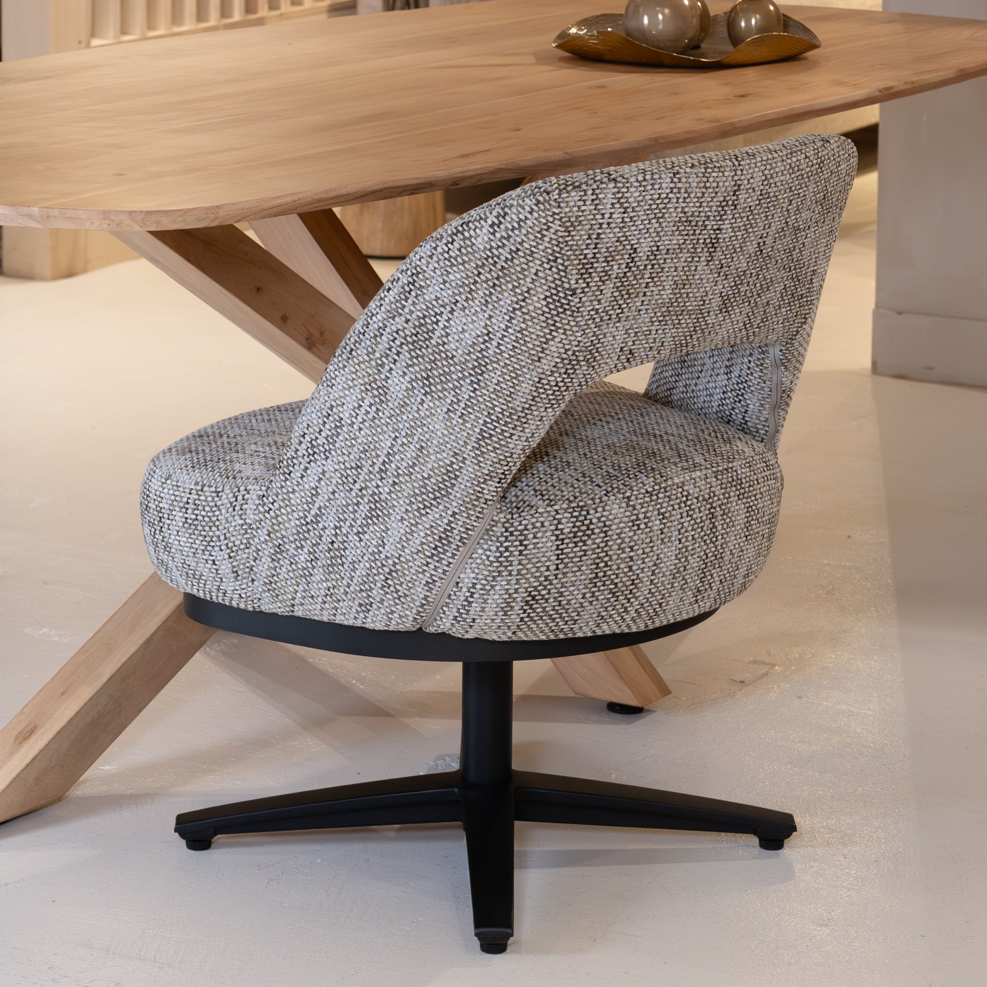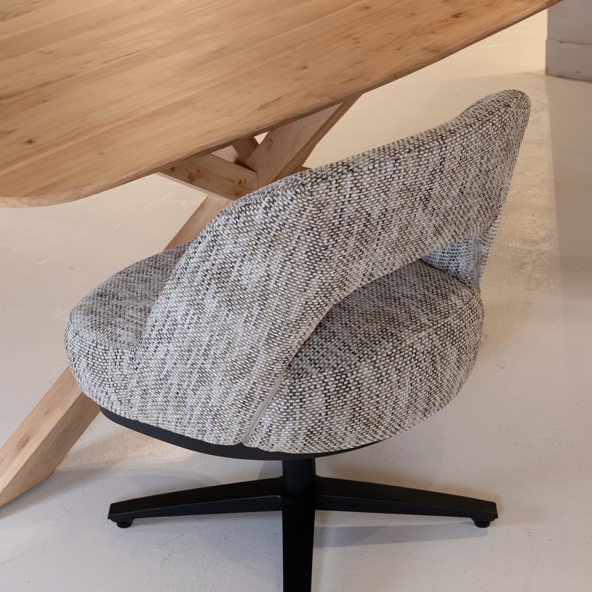 Onderstel: Zwart metalen draaivoet (360°) – stabiel en elegant