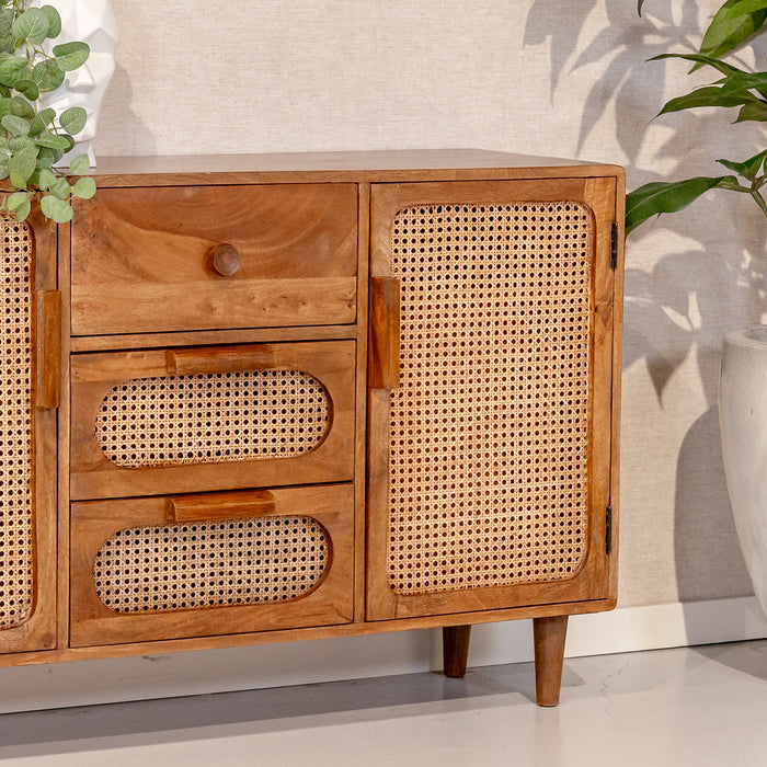 Het unieke karakter ontstaat ook door de webbing-details. Deze webbing-details zijn vewerkt in de deurtjes en lades. Dit geeft een speelse look aan het dressoir en zorgt ervoor dat dit dressoir er niet één uit duizenden is. Door deze kast heb jij genoeg opbergruimte. Ook kan je jouw favoriete accessoires plaatsen op deze prachtige kast.