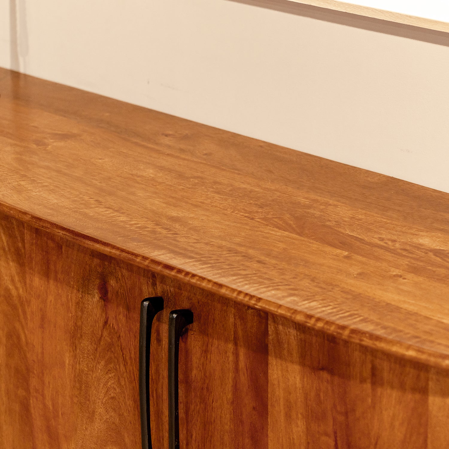 Dit mangohouten dressoir is een perfecte aanvulling op je interieur. Het biedt niet alleen veel opbergruimte, maar dient ook als stijlvolle eyecatcher. De combinatie van natuurlijk mangohout met zwarte poten geeft dit meubel een moderne uitstraling.