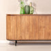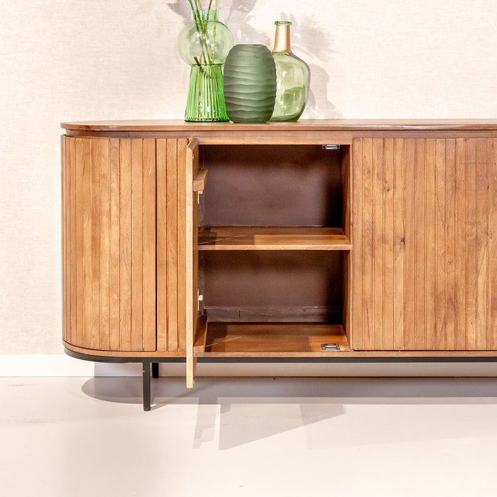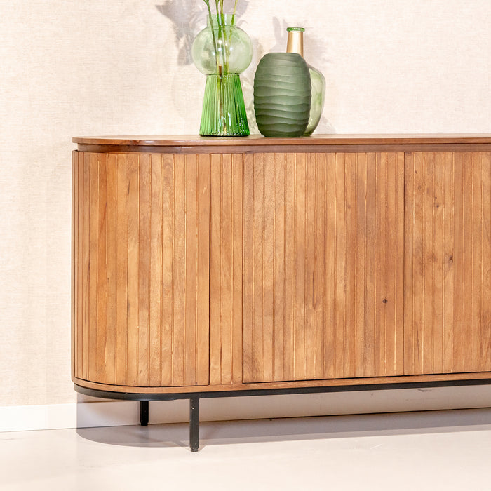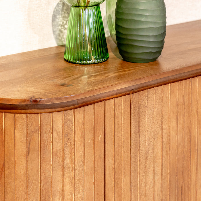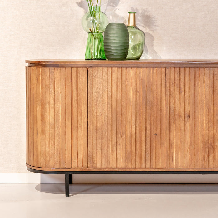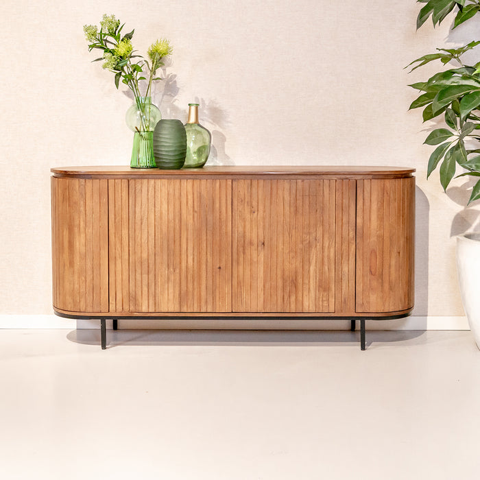 Dressoir Noor is een uniek mangohouten meubelstuk, ontworpen met afgeronde hoeken voor een moderne uitstraling.