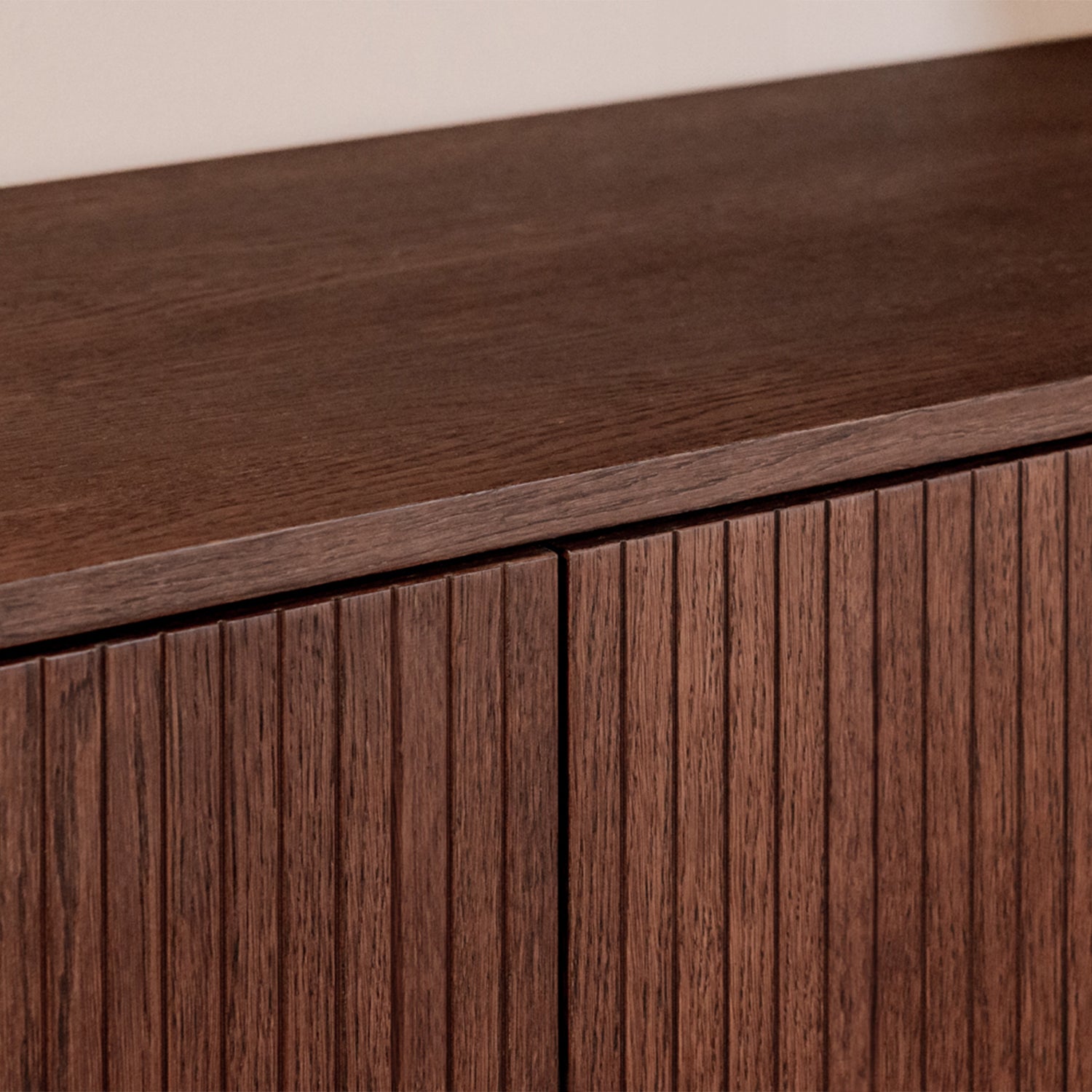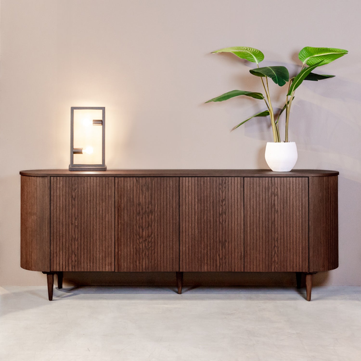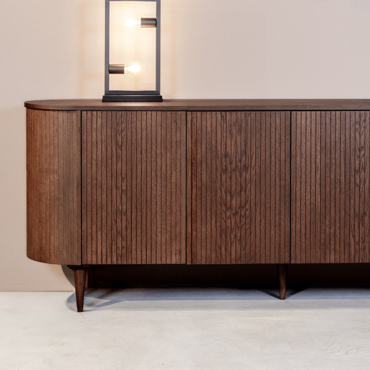 Maak kennis met het Dressoir Oliva in Walnoot Eikenhout. Oliva is niet zomaar een dressoir; het is een speels vormgegeven opbergkast met een vaste plank die slim is verdeeld door twee elegante deurtjes met een handig druksysteem.