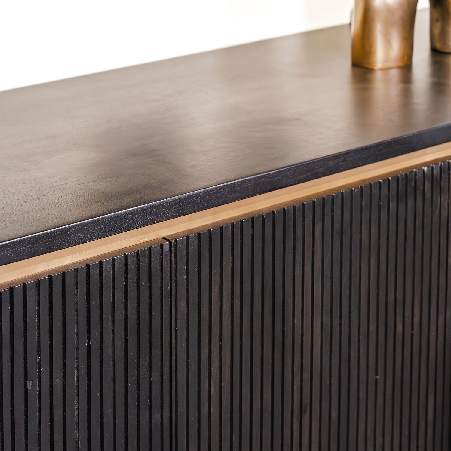 Of je het dressoir gebruikt voor opslag of als stijlvolle toevoeging aan je interieur, de combinatie van zwart mangohout en brass accenten brengt een jonge en frisse uitstraling. Het mangohout staat bekend om zijn duurzaamheid, waardoor je lang van dit dressoir kunt genieten.