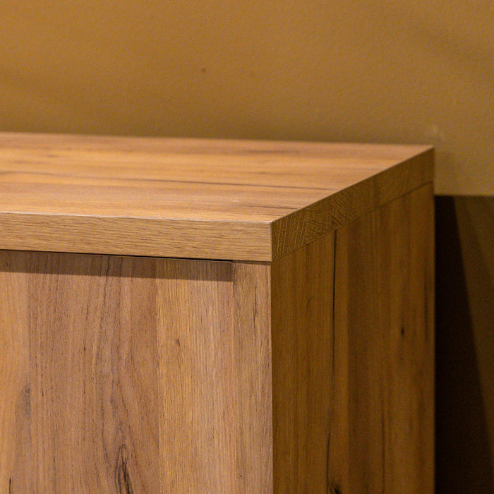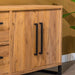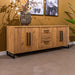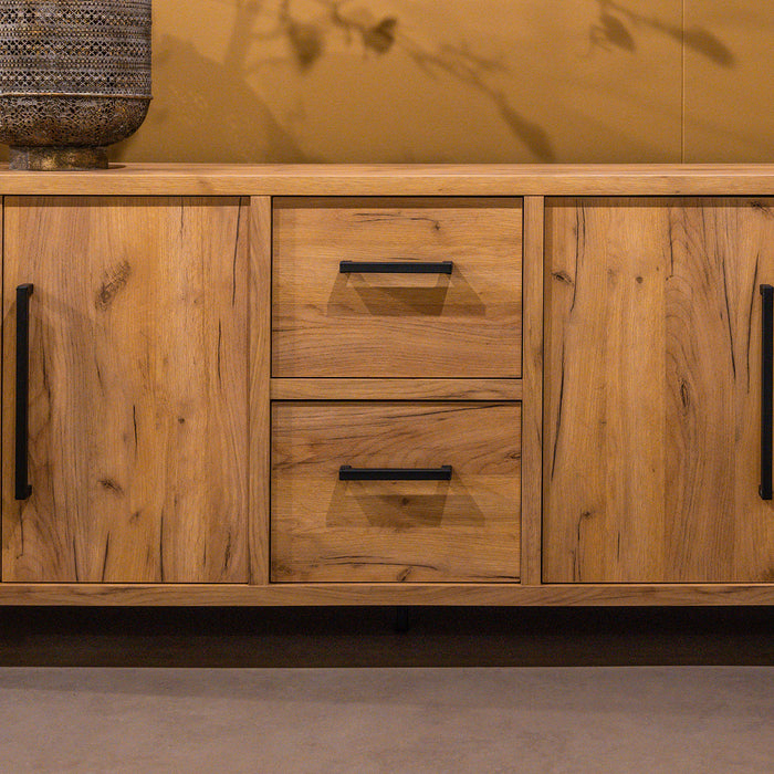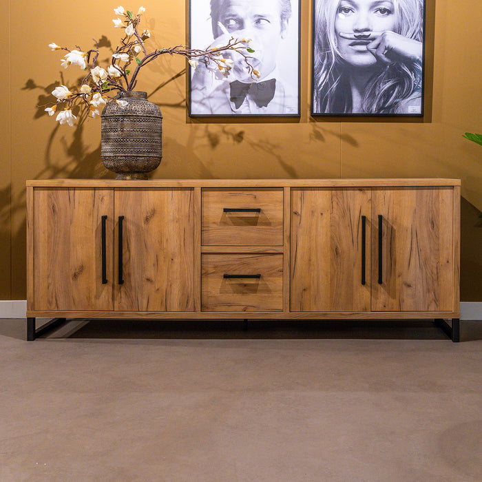 Dressoir Ronda bestaat uit 4 deuren en 2 lades. Het perfecte aan dit dressoir is dat er gebruik gemaakt is van een van softclose. Hiermee sluit opent en sluit het dressoir perfect en geruisloos. De zwarte stalen handgrepen en zwarte onderstel geven dit dressoir een strak uiterlijk. De houtlook die verwerkt is in het meubelpaneel materiaal geeft dit dressoir een modern en natuurlijke uitstraling.