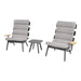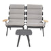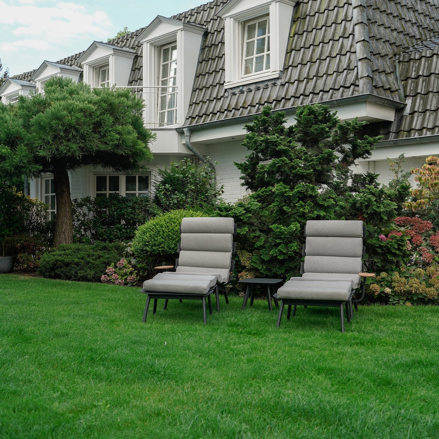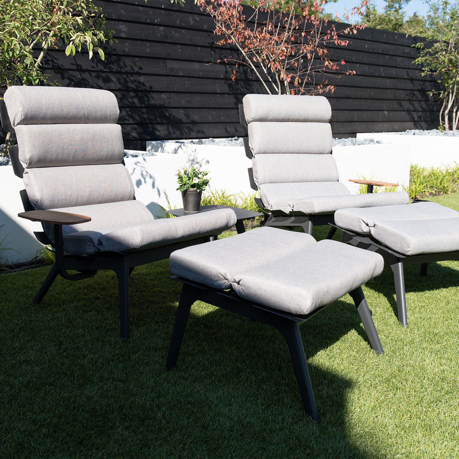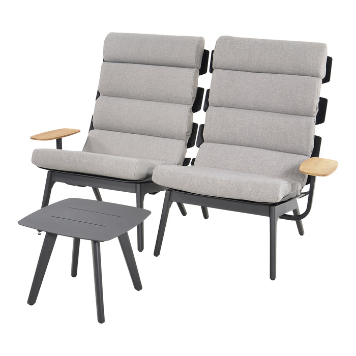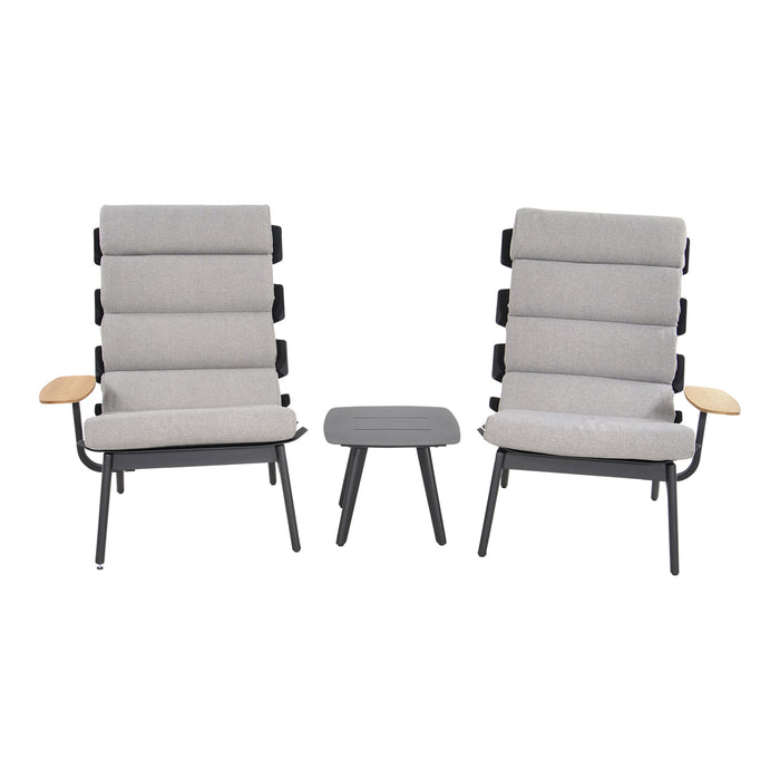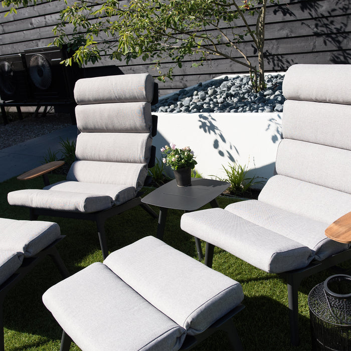 Deze loungeset heeft een stevige Aluminium frame in een Matt Charcoal Kleur, wat zorgt voor een stijlvolle en een moderne uitstraling. De zittingen en rugleuningen van de meubels maken gebruik van polyester kussens die zorgen voor een prettige en ontspannen zithouding. De armleuning is gemaakt van Teakhout.