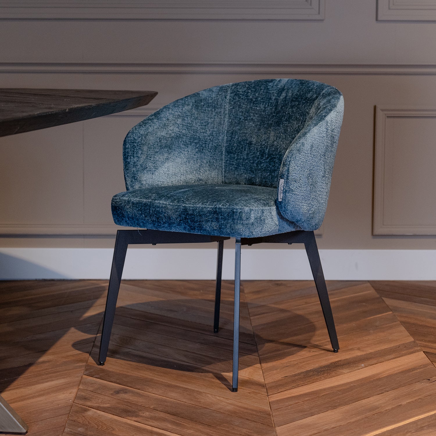 De Eetkamerstoel Amphara in blauw is gestoffeerd met een fijne stof en heeft poten van metaal. De eetkamerstoel heeft armleuningen voor een comfortabele zitting.