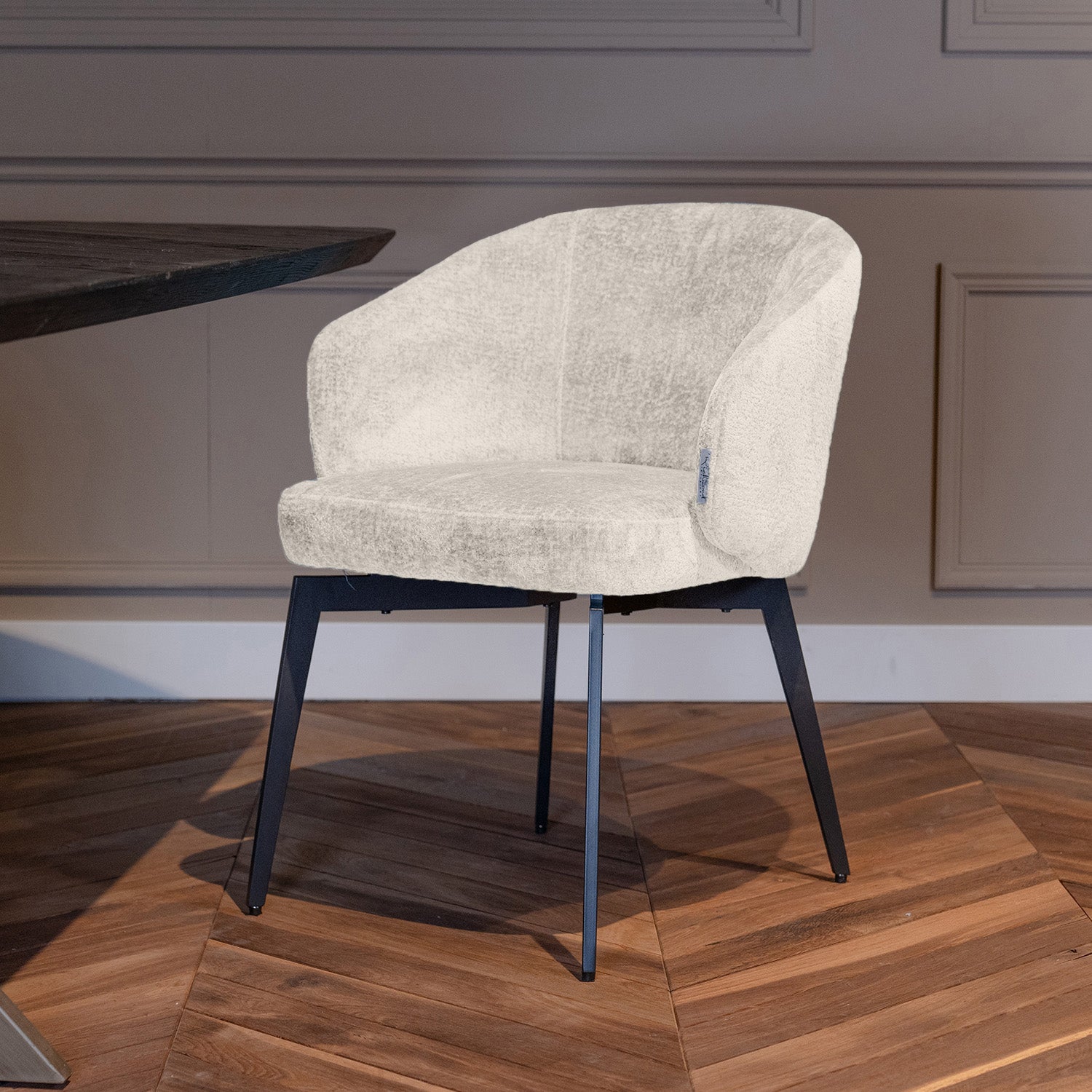 De Eetkamerstoel Amphara in wit is gestoffeerd met een fijne stof en heeft poten van metaal. De eetkamerstoel heeft armleuningen voor een comfortabele zitting.