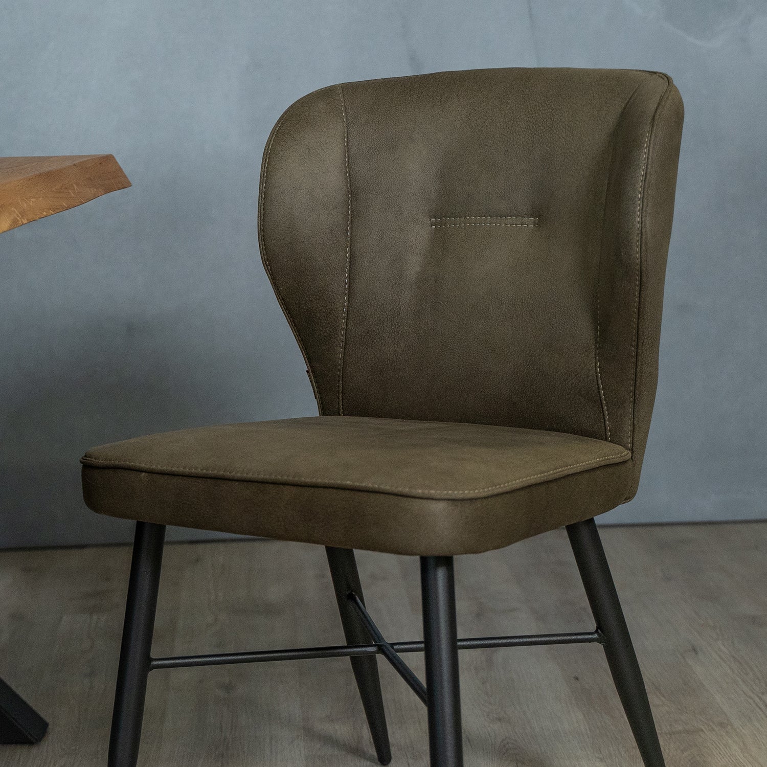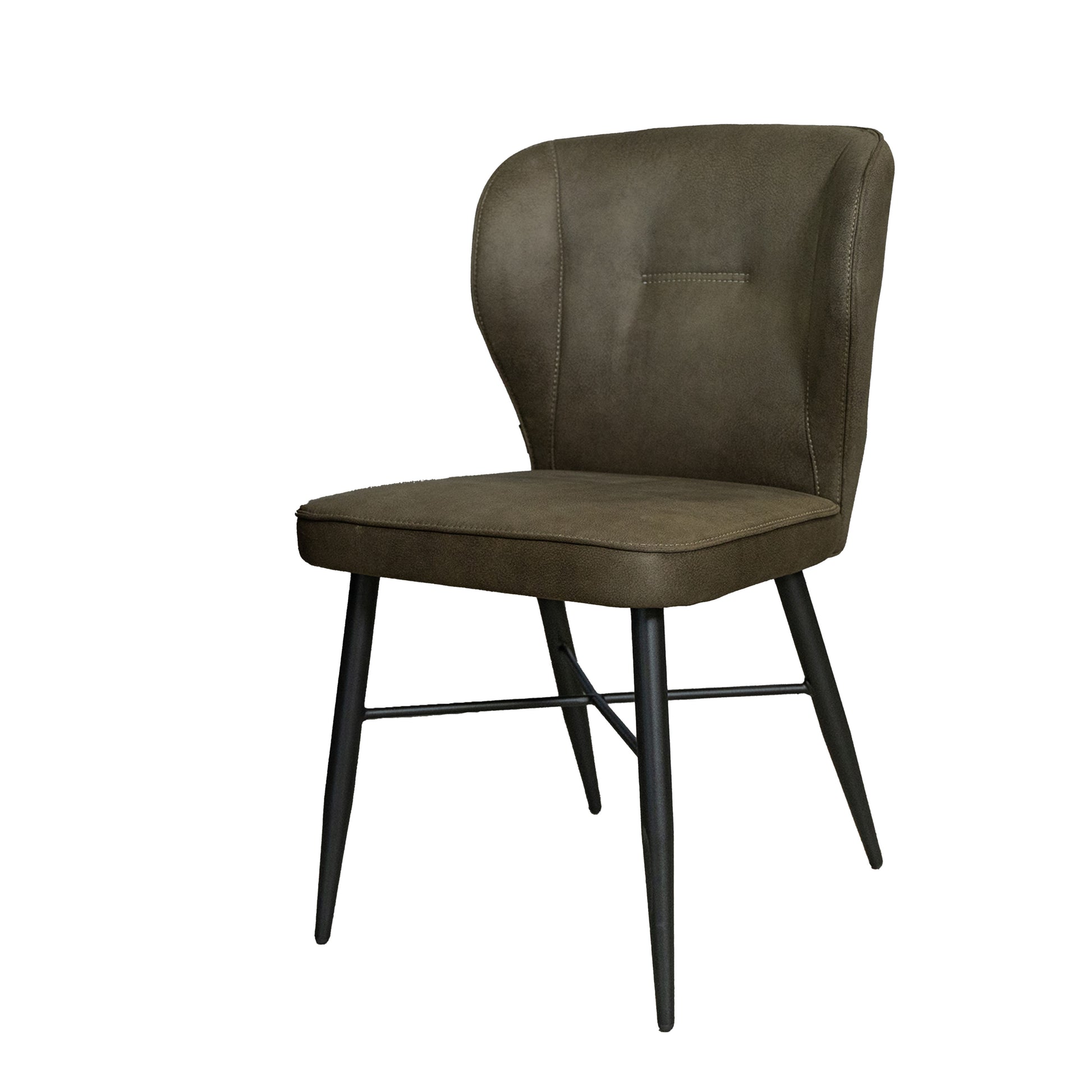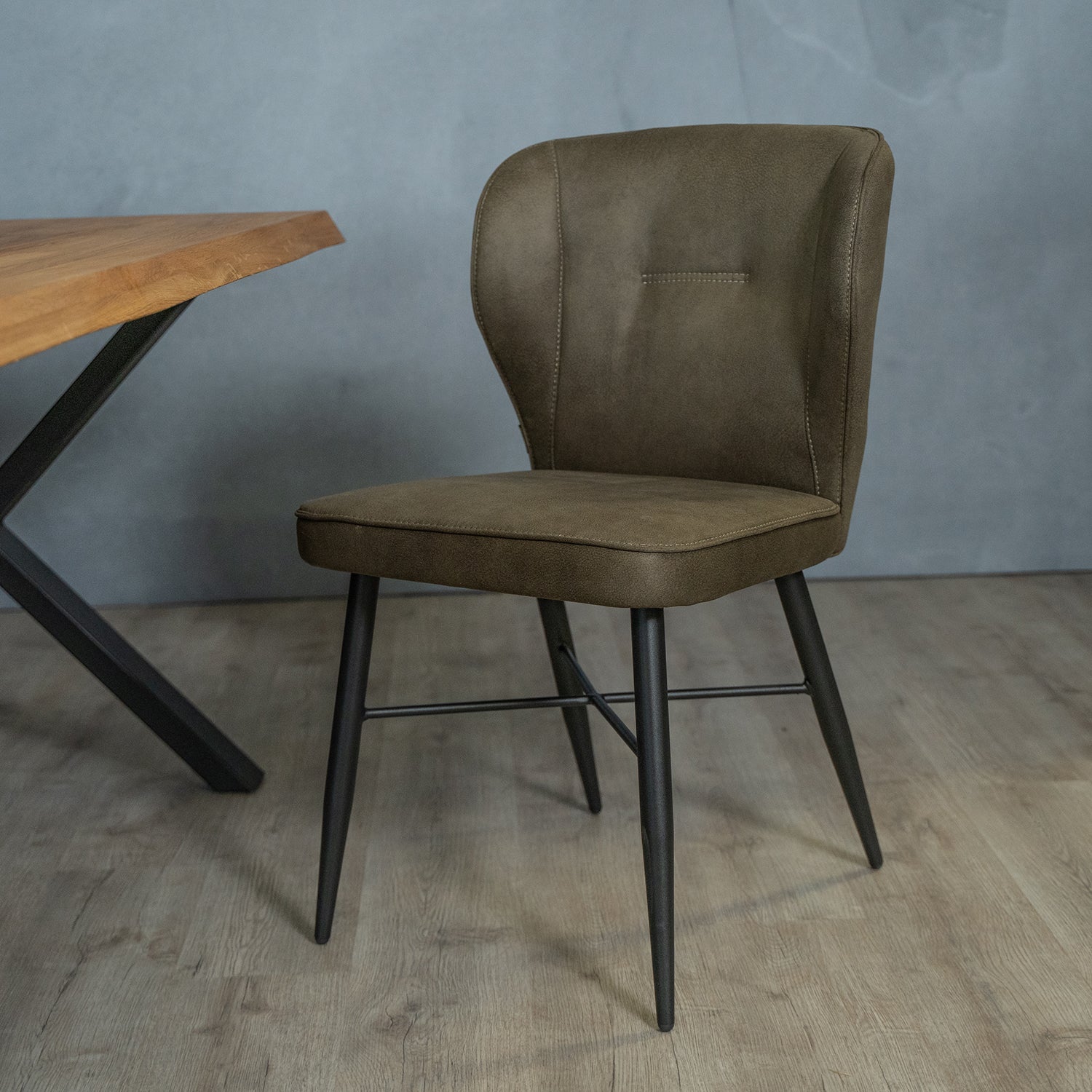 Maak kennis met de Eetkamerstoel Beauty in Army. Zoals de naam al zegt, is dit een echte 'beauty'. De aan de zijkant schuine rugleuning biedt extra comfort en stimuleert bovendien een juiste zithouding. Het zitoppervlak is ruim en zacht. De metalen poten lopen lichtjes naar buiten waardoor de stoel stevig staat.