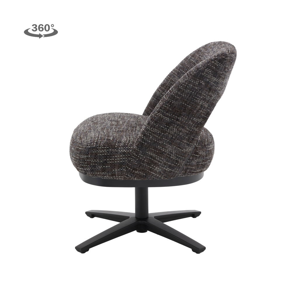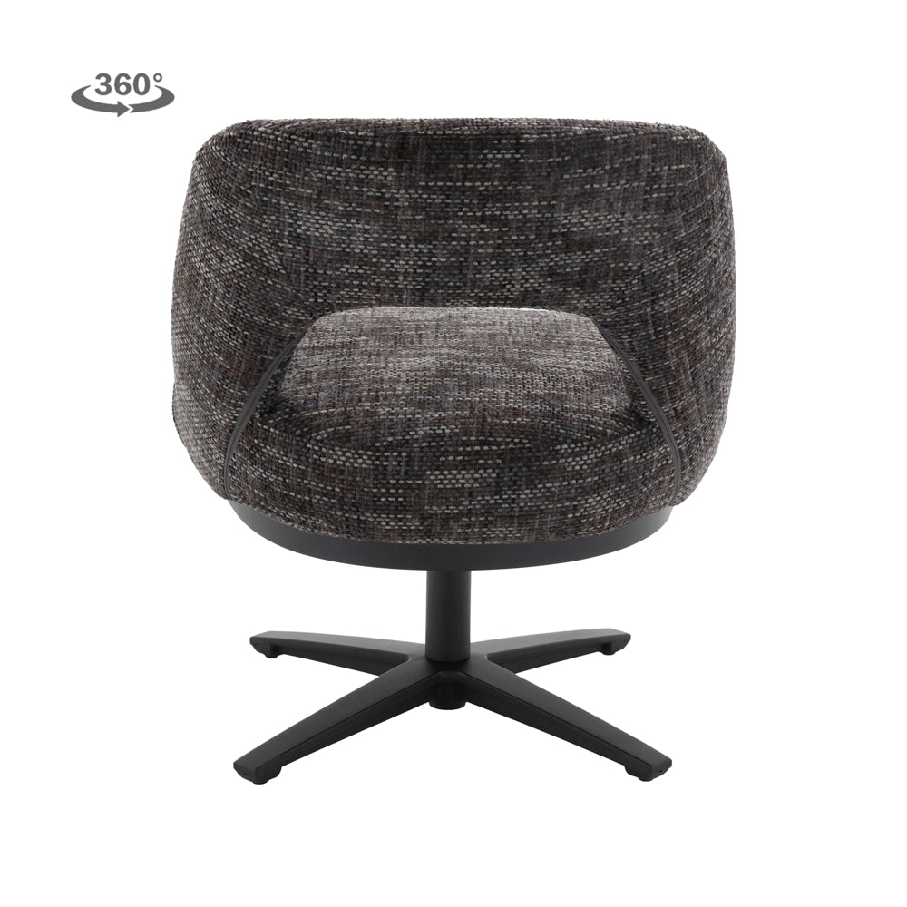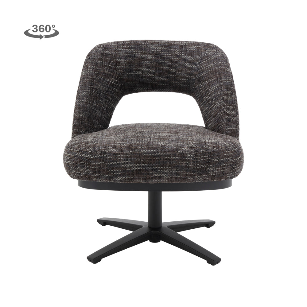 De Caldes Eetkamerstoel | Donkergrijze Stof van Tower Living combineert ultiem zitcomfort met een modern design. Deze stijlvolle draaistoel is bekleed met hoogwaardige stof, die een warme, lichte uitstraling geeft en tegelijkertijd slijtvast en onderhoudsvriendelijk is. De organisch gevormde zitschaal met subtiel geïntegreerde armleuningen biedt optimale ondersteuning en nodigt uit tot lang en ontspannen zitten. Het zwarte metalen onderstel met 360° draaifunctie maakt de stoel niet alleen praktisch, maar ook een speelse toevoeging aan je interieur.