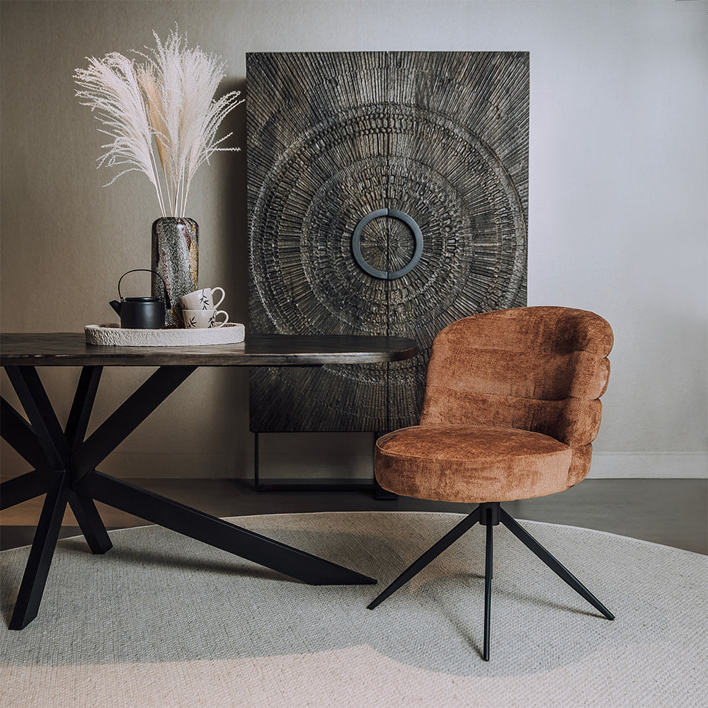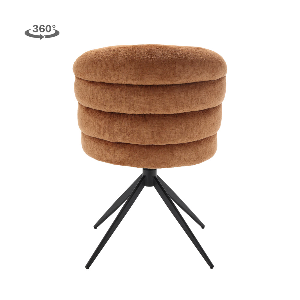 De Eetkamerstoel Carro | Bruin Stof van Tower Living is de perfecte combinatie van elegantie, comfort en functionaliteit. Deze stoel is bekleed met een zachte Bruine stof, die zorgt voor een frisse, tijdloze uitstraling. De zitting is ergonomisch gevormd en voorzien van armleuningen voor extra ondersteuning. Het zwarte 360° draaibare onderstel maakt de stoel praktisch in gebruik, zonder dat je hoeft te schuiven – ideaal voor dynamisch tafelen.