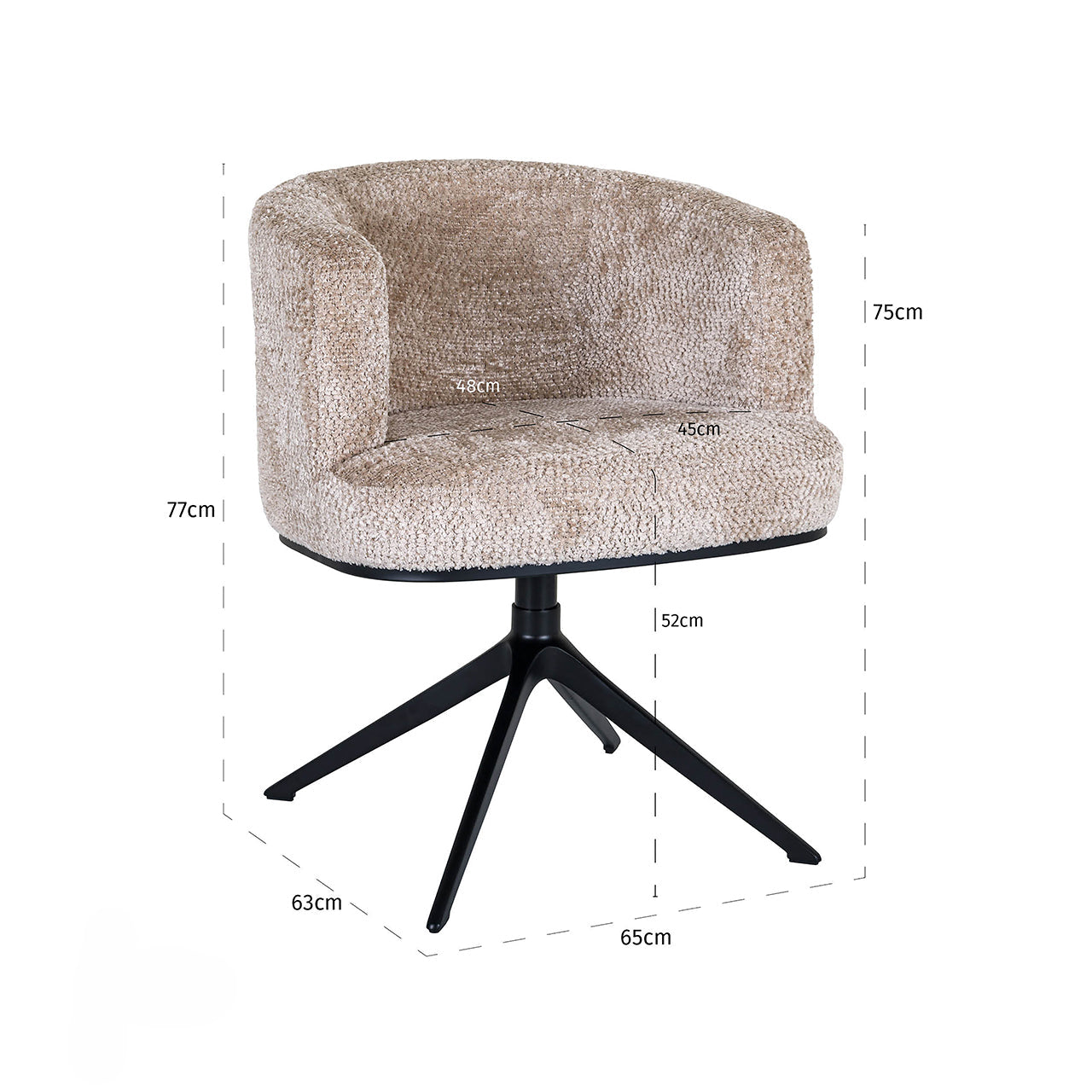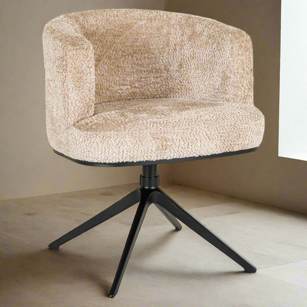 De Draaibare Eetkamerstoel Cheyenne | Bruin Stof van Richmond combineert elegant comfort met eigentijdse functionaliteit. Dankzij de zachte bruin stof en royale vulling creëert deze stoel een uitnodigende zitervaring. Het 360° draaibare zwarte metalen onderstel maakt draaien overbodig en ideaal bij lange diners of gezellige gesprekken. De iconische ronde rug en subtiel gevormde armleuningen geven deze stoel een stijlvolle en moderne uitstraling.