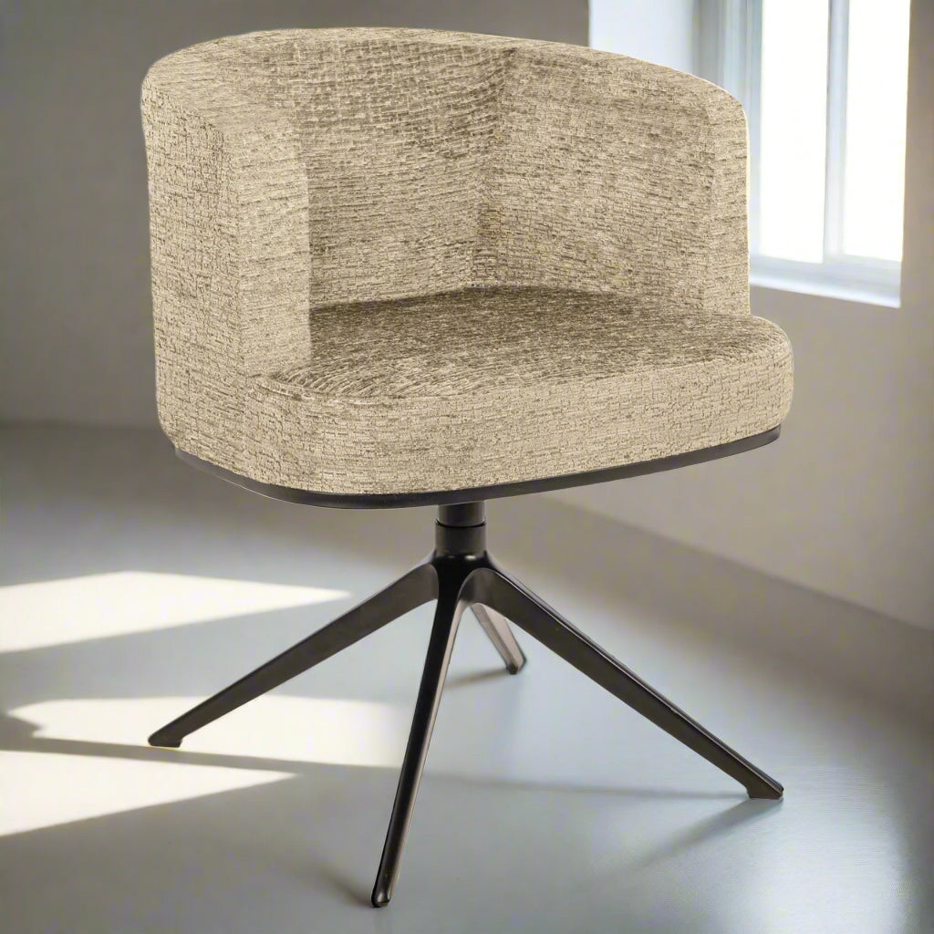 De Draaibare Eetkamerstoel Cheyenne | Zand Stof van Richmond combineert elegant comfort met eigentijdse functionaliteit. Dankzij de zachte zand stof en royale vulling creëert deze stoel een uitnodigende zitervaring. Het 360° draaibare zwarte metalen onderstel maakt draaien overbodig en ideaal bij lange diners of gezellige gesprekken. De iconische ronde rug en subtiel gevormde armleuningen geven deze stoel een stijlvolle en moderne uitstraling.