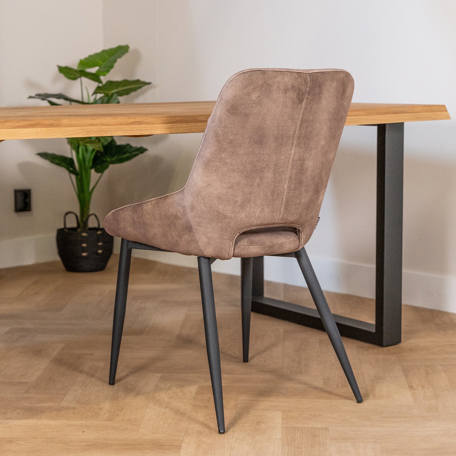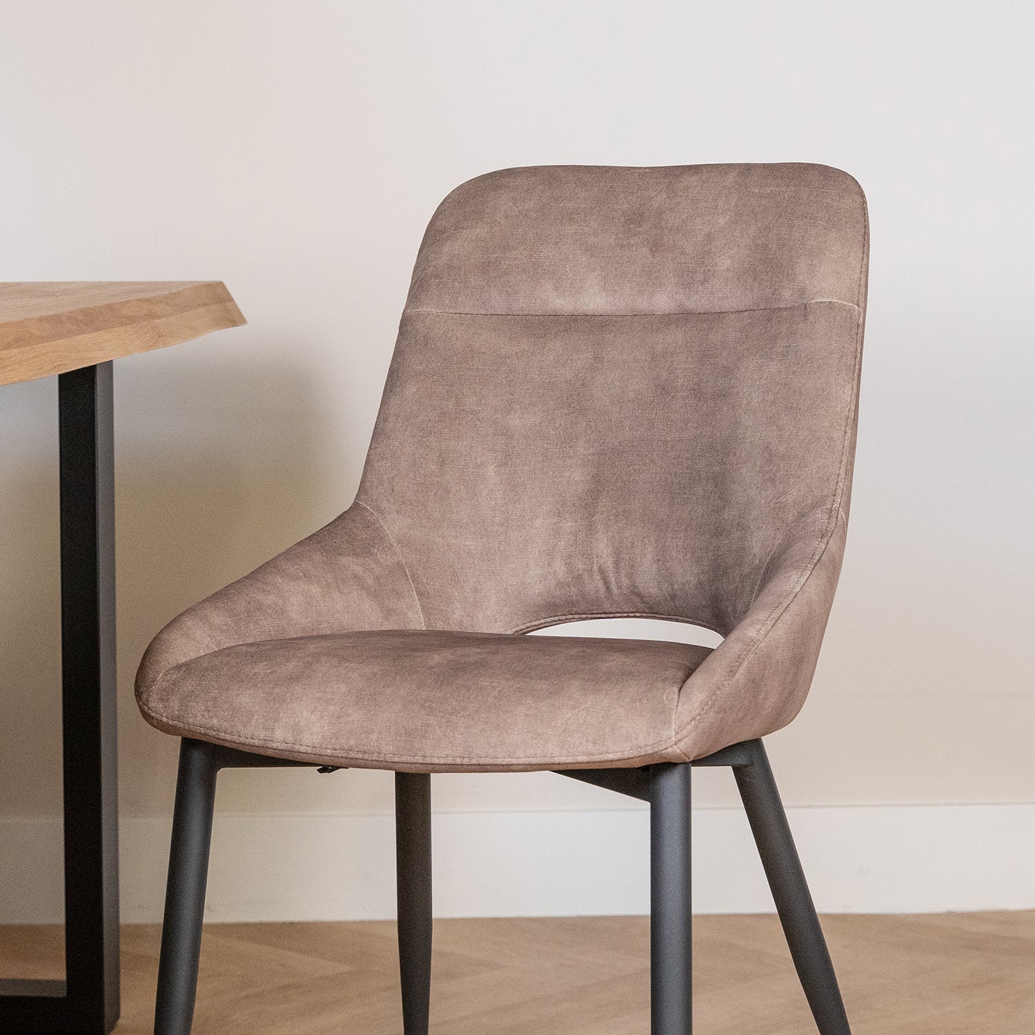 Deze eetkamerstoel krijgt een speels karakter door de velvet stof en door de opening in de rugleuning. Deze opening geeft een chique en unieke uitstraling aan de stoel, wanneer deze aan de eetkamertafel staat. De 4 zwarte metalen poten zorgen ervoor dat deze stoel mooi afsteekt tegen de vloer en de stoel echt opvalt in het interieur.