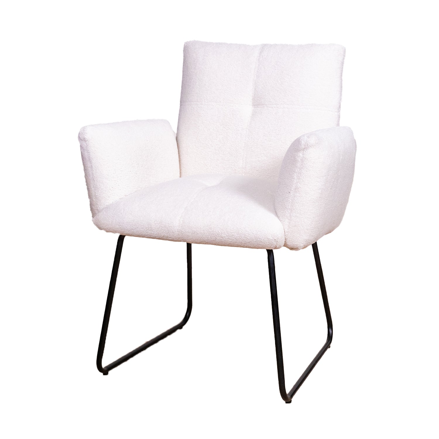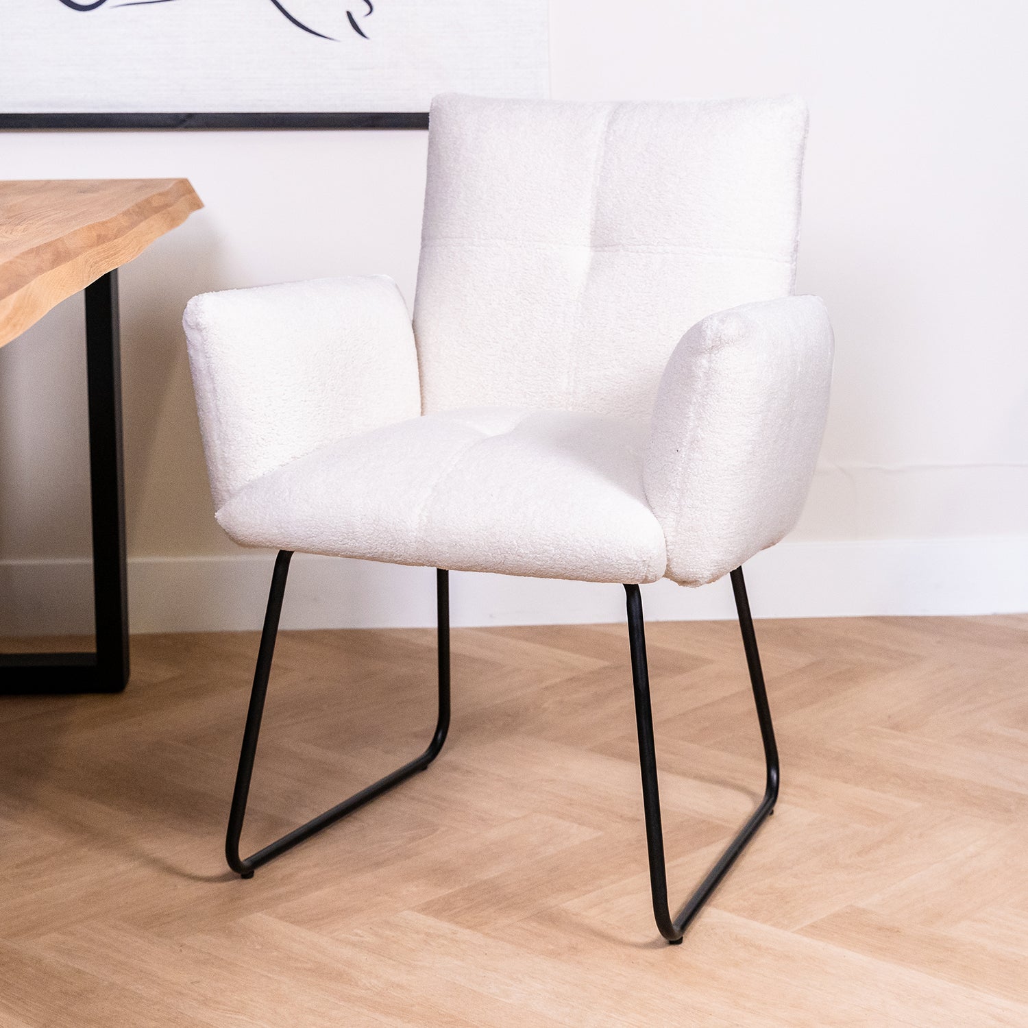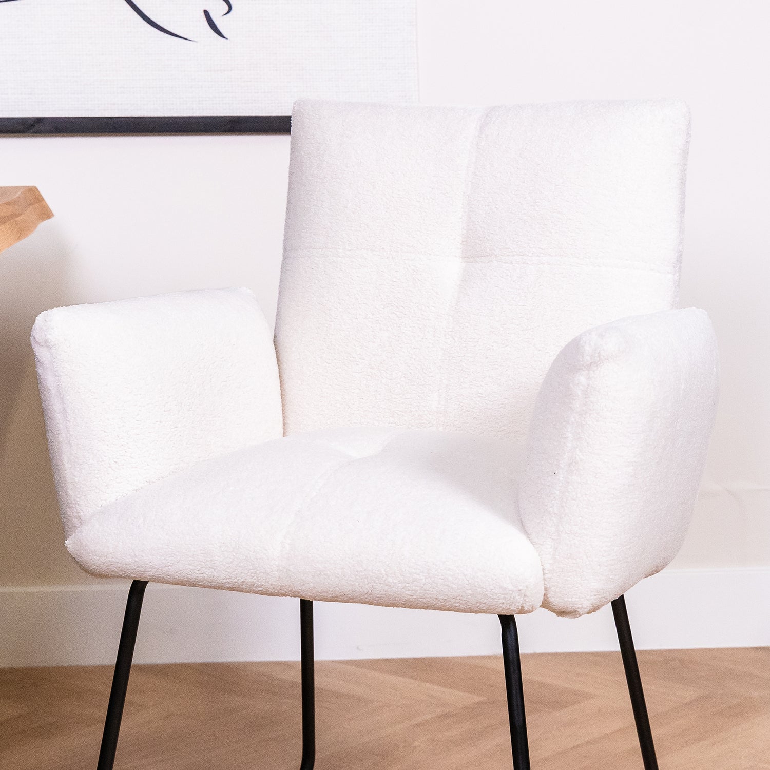 Eetkamerstoel Dante is een hippe eetkamerstoel in een populaire Teddy stof. Deze heerlijke zachte stof past perfect in een modern en chique interieur. Eetkamerstoel Dante is daarnaast ook nog eens uitgerust met een enorm dik gestoffeerde zitting, rugleuning en armleuningen. Dit geeft deze Teddy eetkamerstoel een bijzonder hoog knuffel gehalte. Want zeg nou eerlijk, wil jij niet direct op deze stoel gaan zitten nu je hem ziet?