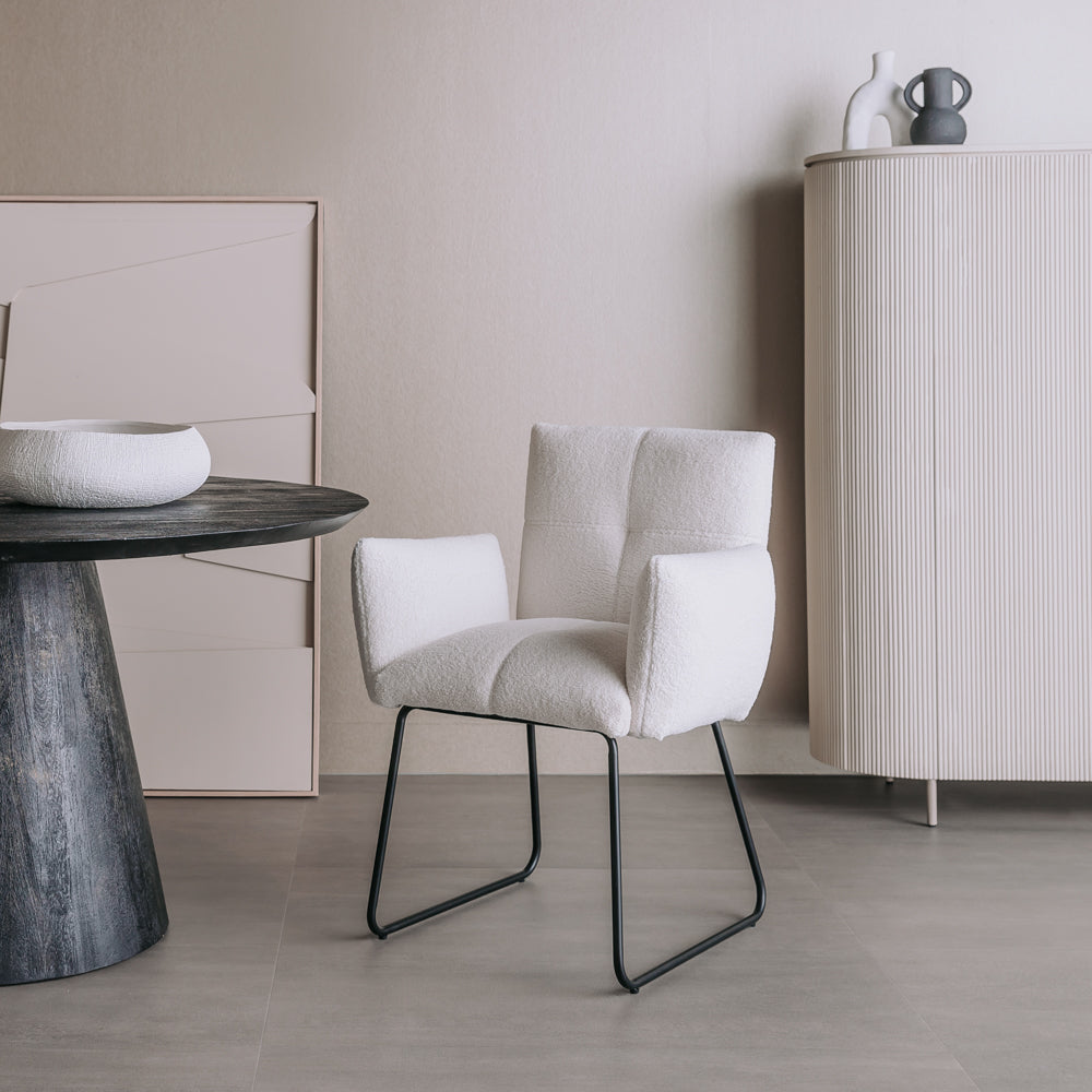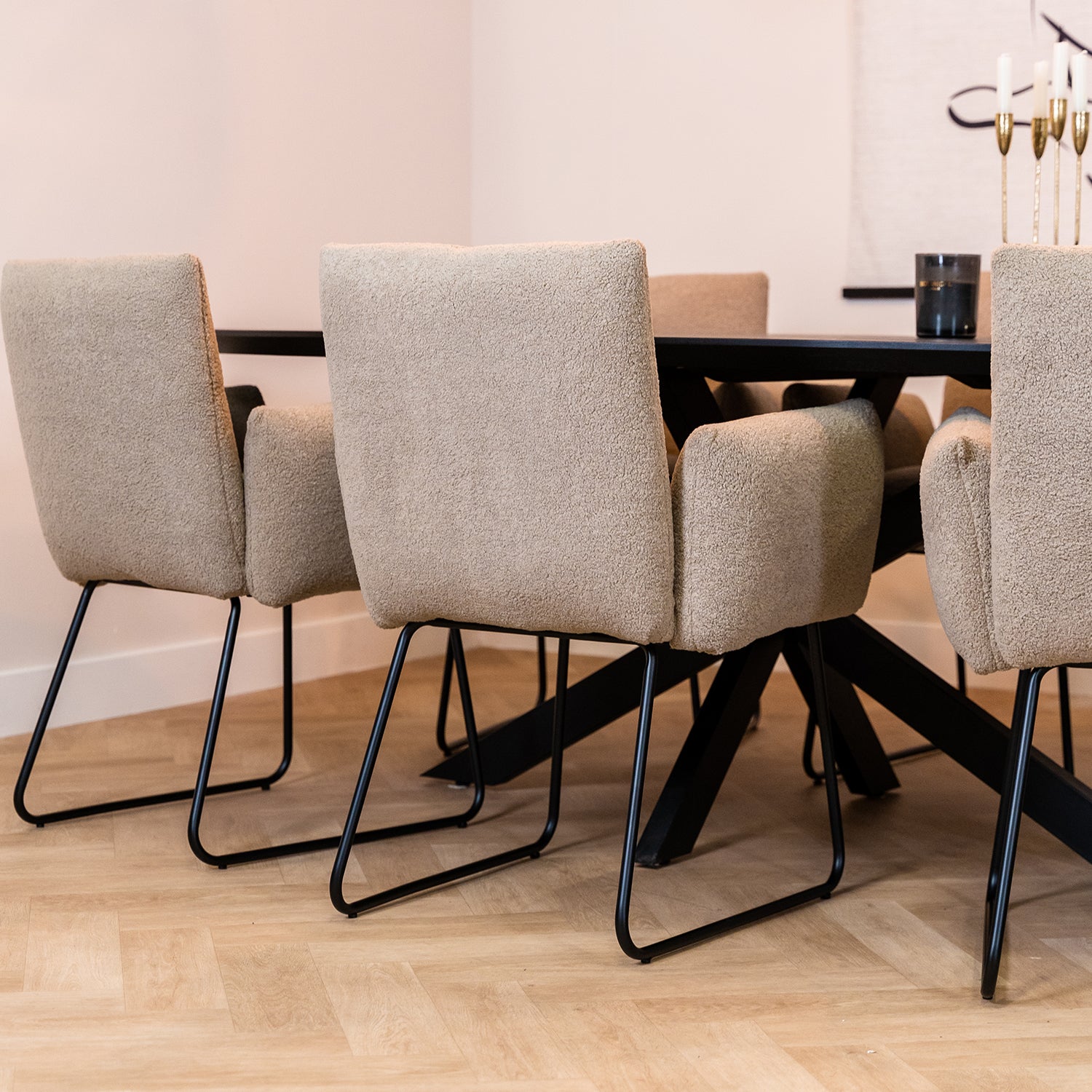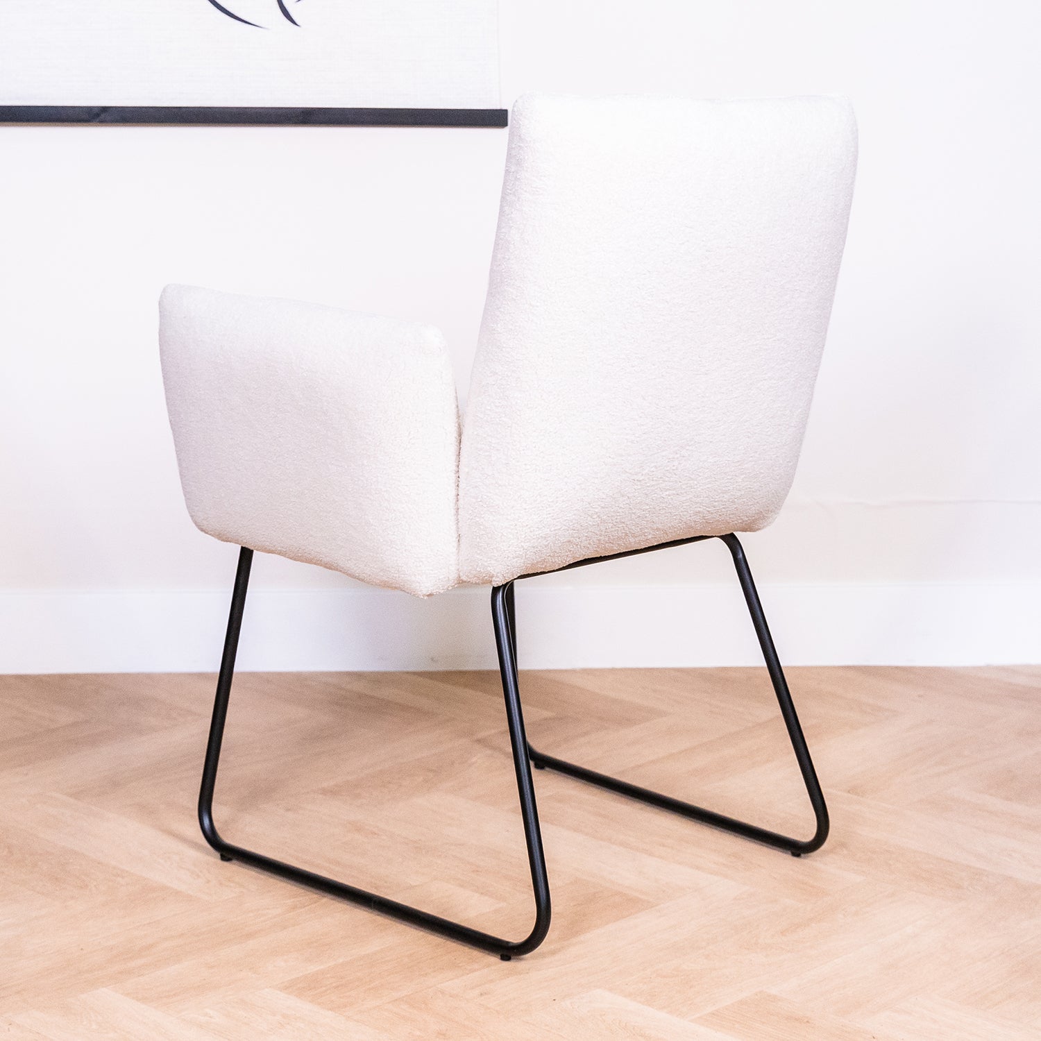 Eetkamerstoel Dante is een hippe eetkamerstoel in een populaire Teddy stof. Deze heerlijke zachte stof past perfect in een modern en chique interieur. Eetkamerstoel Dante is daarnaast ook nog eens uitgerust met een enorm dik gestoffeerde zitting, rugleuning en armleuningen. Dit geeft deze Teddy eetkamerstoel een bijzonder hoog knuffel gehalte. Want zeg nou eerlijk, wil jij niet direct op deze stoel gaan zitten nu je hem ziet?