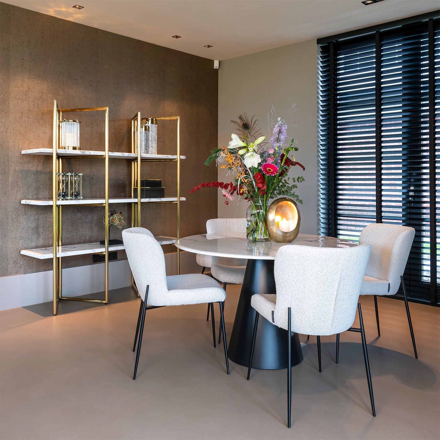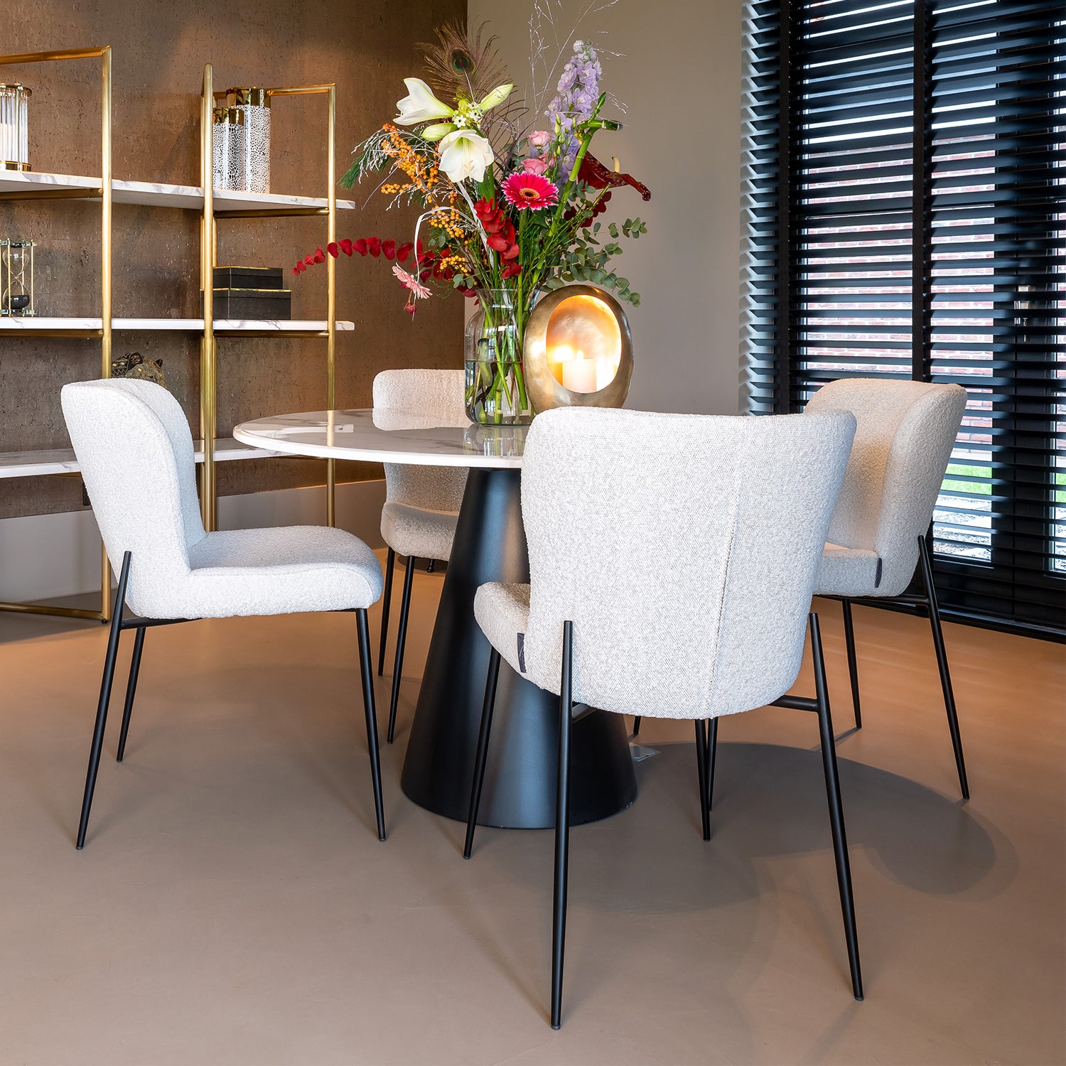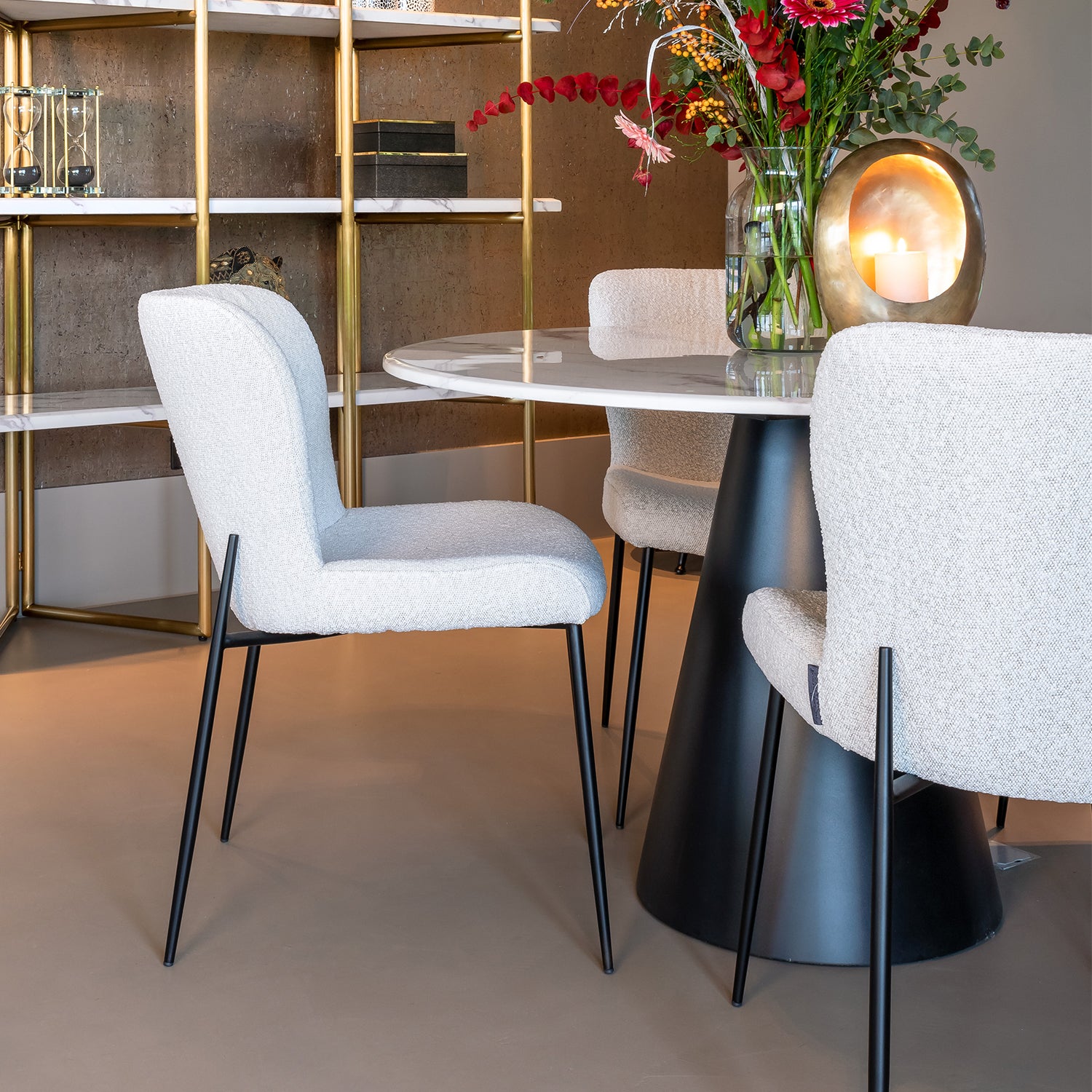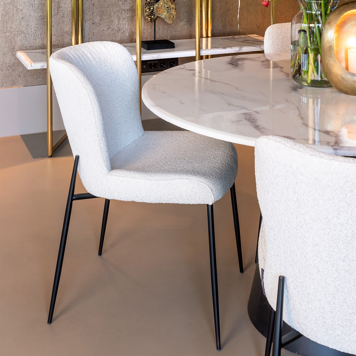 Maak kennis met de Eetkamerstoel Darby in Wit Bouclé. De combinatie van de groene stof en het zwarte metalen onderstel geven een chique look aan jouw huis.