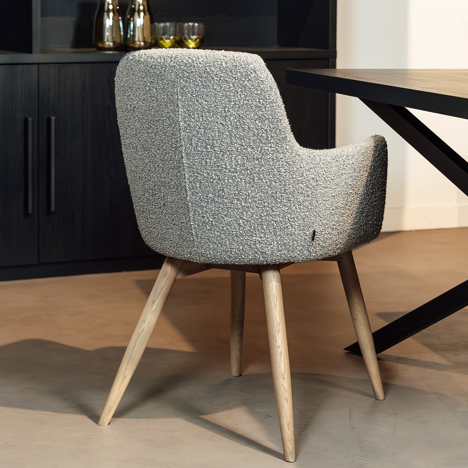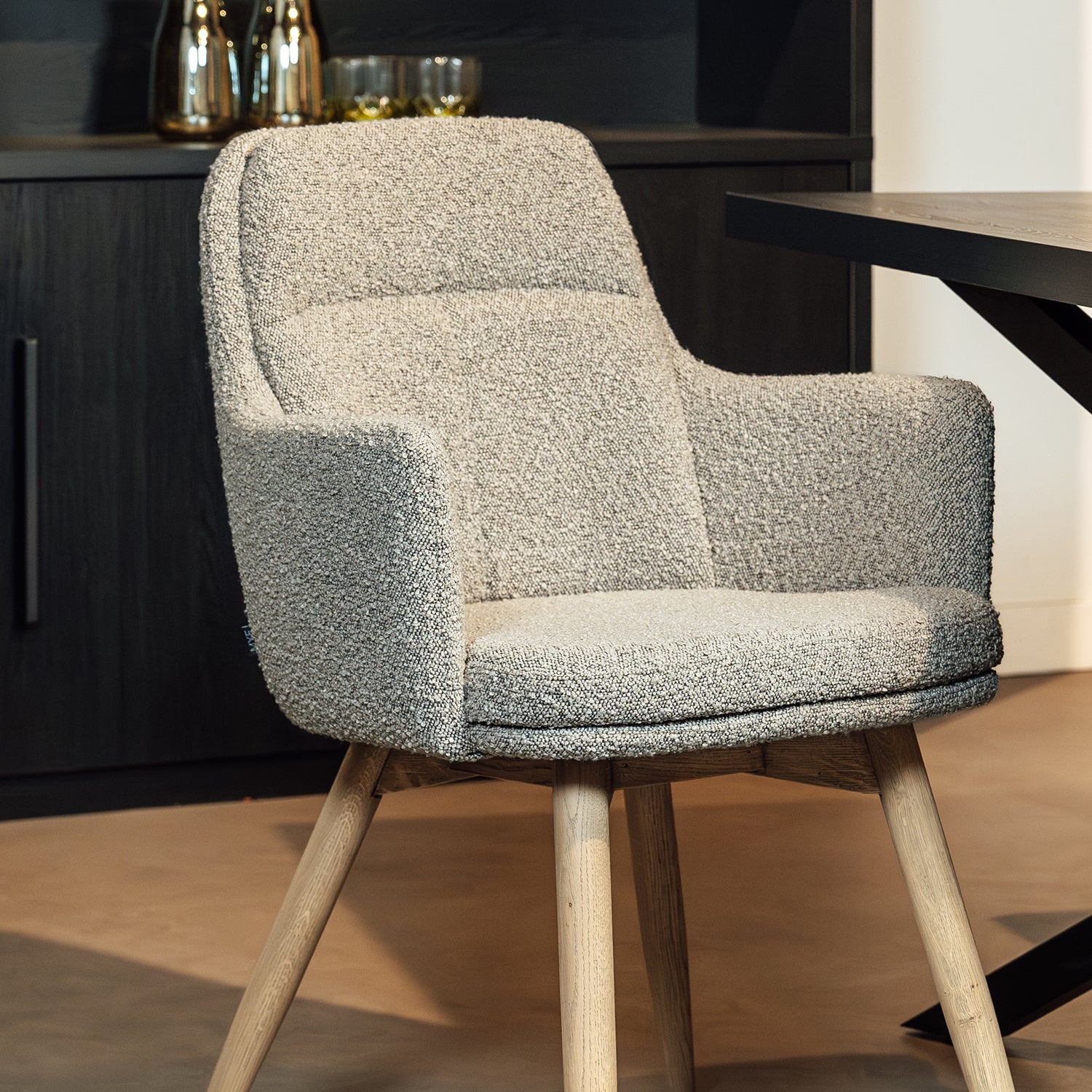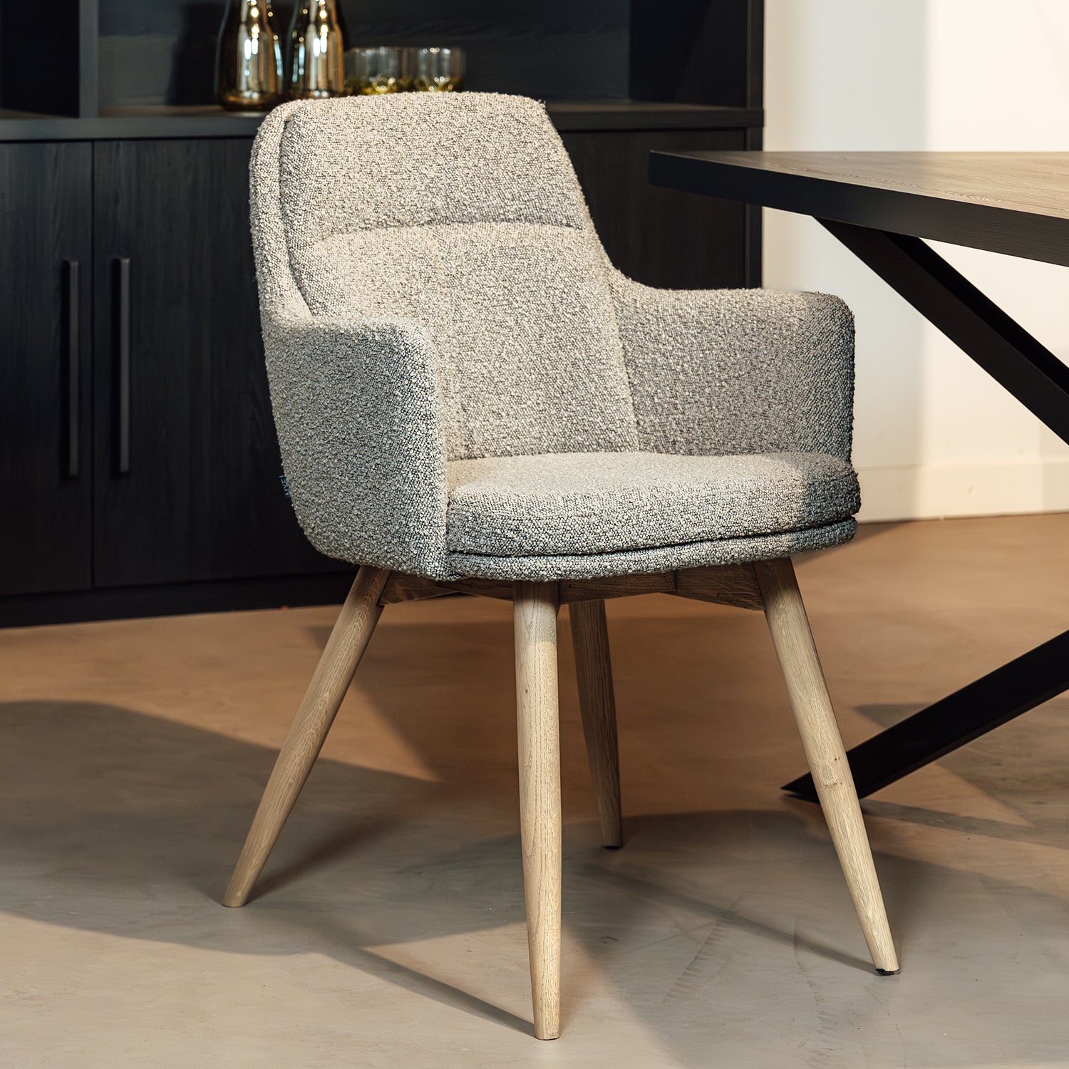 Met zijn ergonomische vormgeving biedt de Dean Eetkamerstoel niet alleen comfort, maar ook een lange levensduur, dankzij de combinatie van hoogwaardige stoffen en stevige eikenhouten poten. Deze stoel is de perfecte keuze voor wie stijl, comfort en duurzaamheid in één wil combineren.