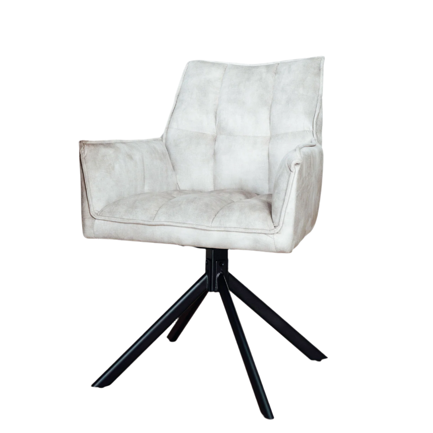 Deze chique eetkamerstoel is een prachtige toevoeging aan je interieur. De zachte zitting, rugleuning en de armleuningen creëren heerlijk zitgemak. De stoel is 180° draaibaar en heeft een return memory functie wat betekend dat hij terugkeert naar zijn originele positie. De metalen spinpoot zorgt ervoor dat de eetkamerstoel stevig staat.