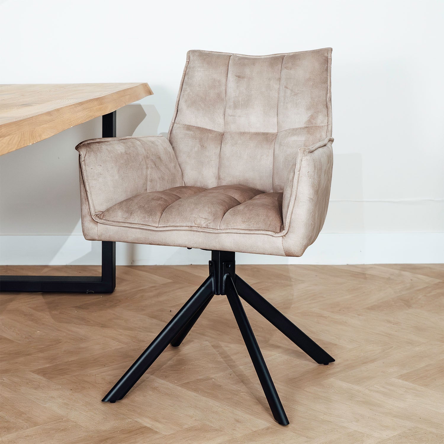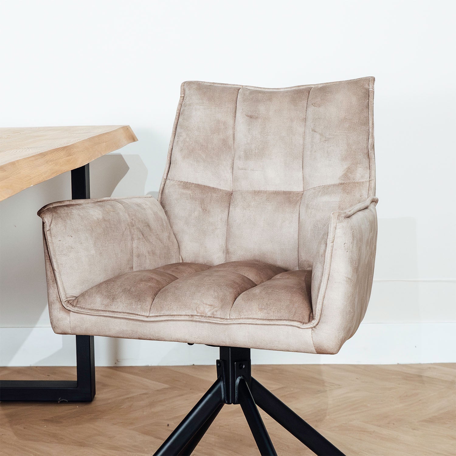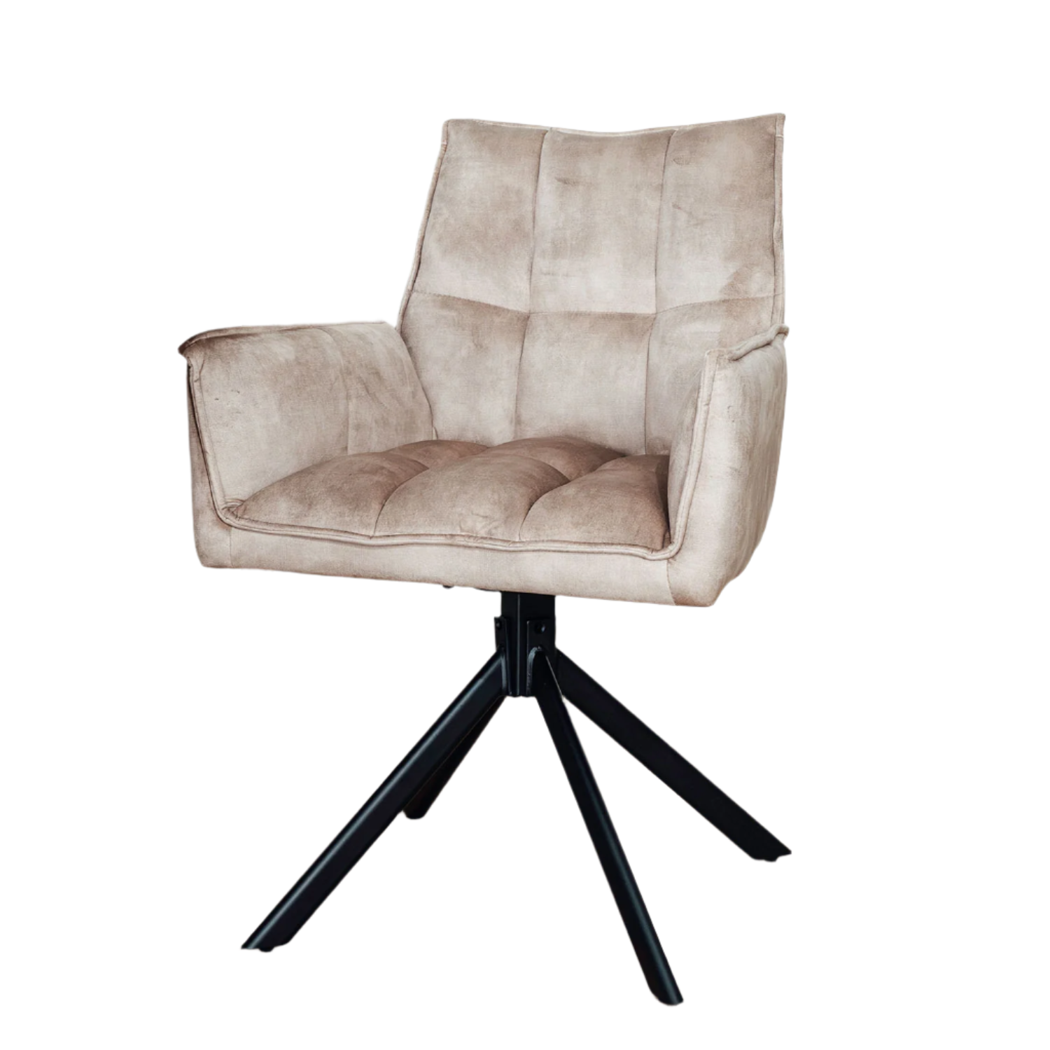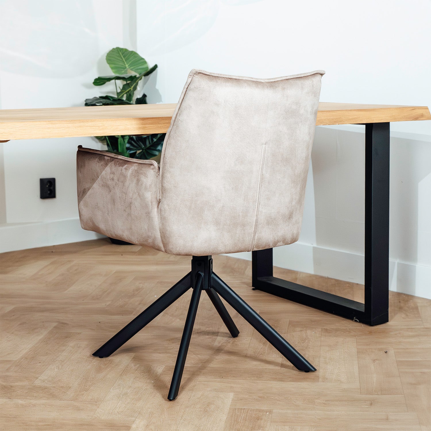 Deze chique eetkamerstoel is een prachtige toevoeging aan je interieur. De zachte zitting, rugleuning en de armleuningen creëren heerlijk zitgemak. De stoel is 180° draaibaar en heeft een return memory functie wat betekend dat hij terugkeert naar zijn originele positie. De metalen spinpoot zorgt ervoor dat de eetkamerstoel stevig staat.