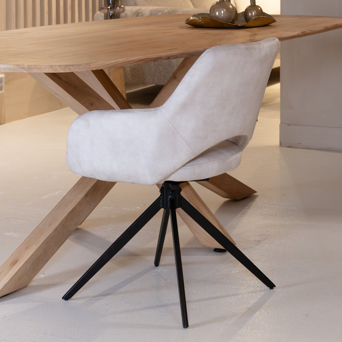 Eetkamerstoel Evi in luxueus velvet combineert comfort, stijl en gebruiksgemak perfect. De draaibare eetkamerstoel met armleuning biedt een royale zithouding en een chique uitstraling. Verkrijgbaar in 3 hoogwaardige stoffen en 6 stijlvolle kleuren, is deze velvet editie een echte eyecatcher voor elke eetkamer of woonruimte.