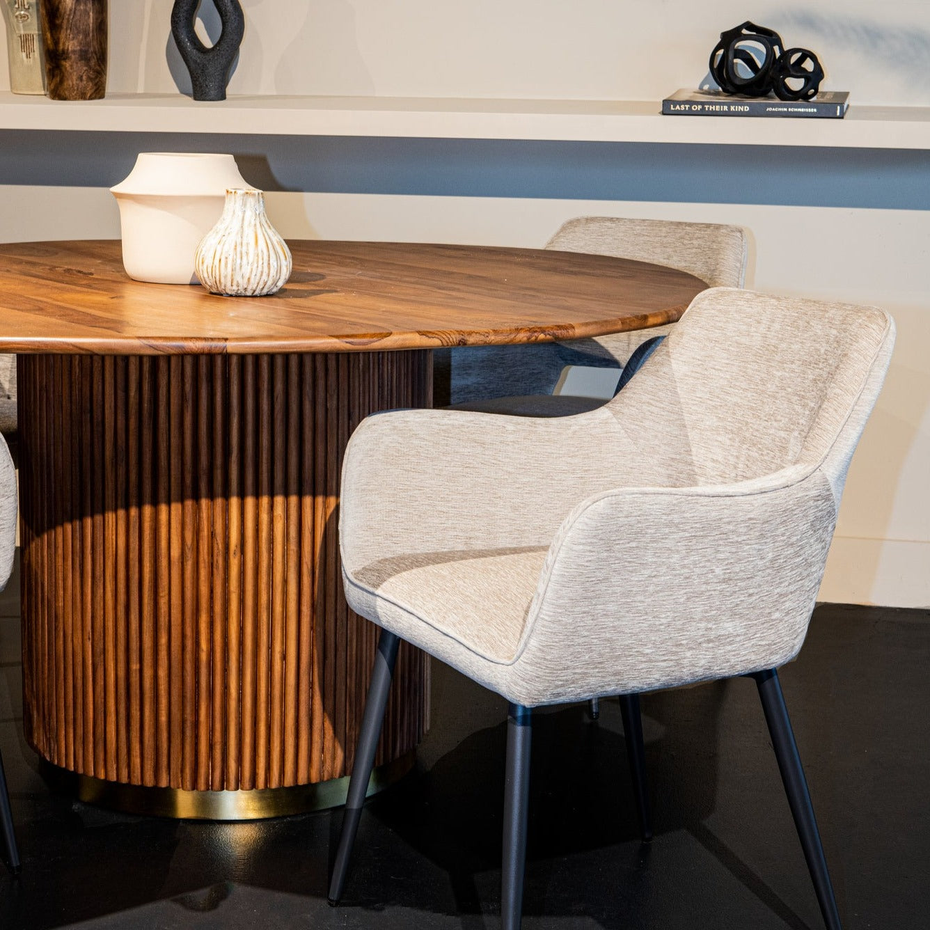 Ervaar ultiem comfort en stijl met de eetkamerstoel Fallax in Cream. Deze kuipstoel met armleuningen biedt niet alleen een aangename zitervaring, maar ook een unieke functionaliteit dankzij de opening aan de achterzijde, waardoor je gemakkelijk naar achteren kunt schuiven voor extra comfort. De zachte stoffering en het ontwerp voegen een vleugje elegantie toe aan elke eetruimte.