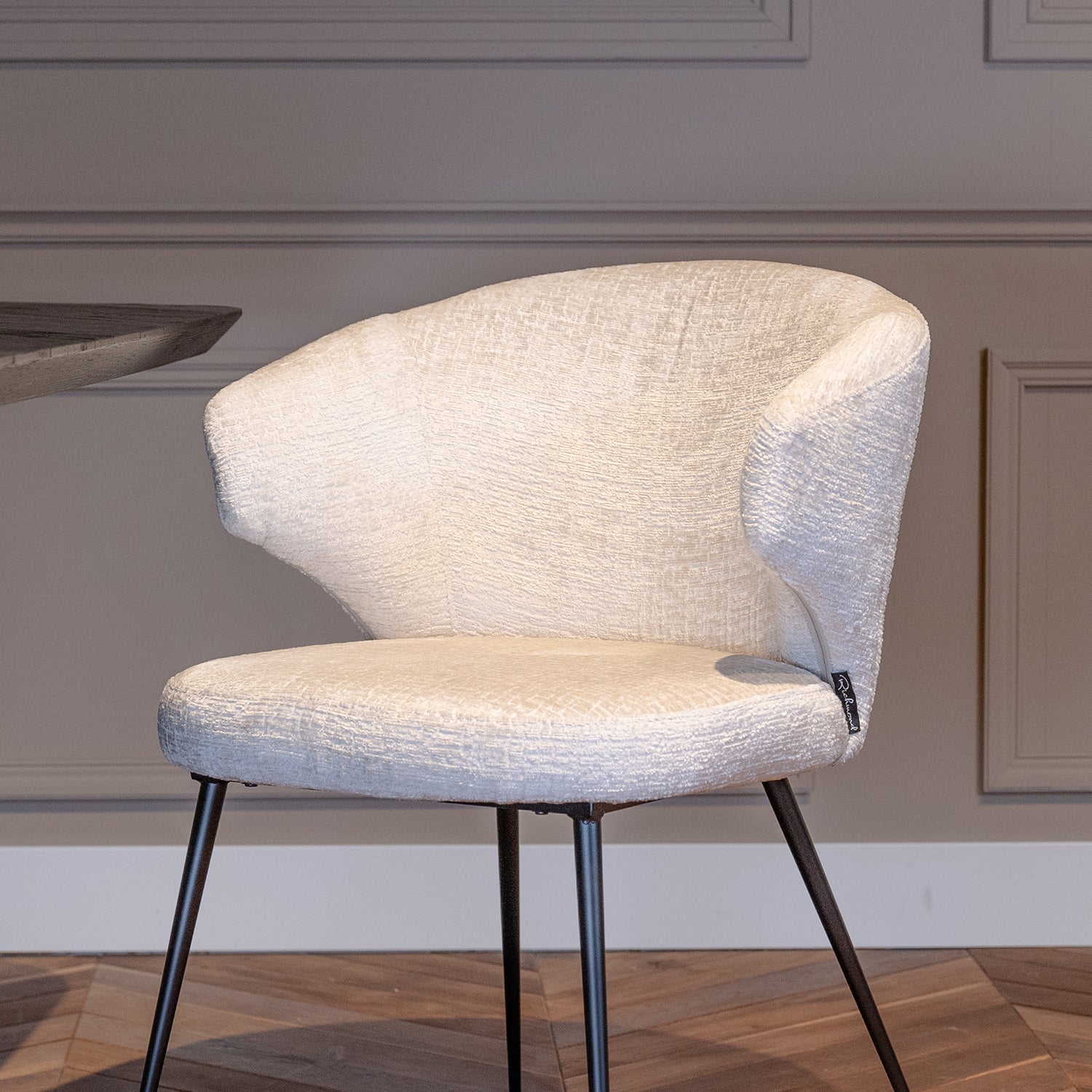 De Eetkamerstoel Indigo in wit is gestoffeerd met een fijne stof en heeft poten van metaal. De eetkamerstoel wit heeft armleuningen voor een comfortabele zitting.