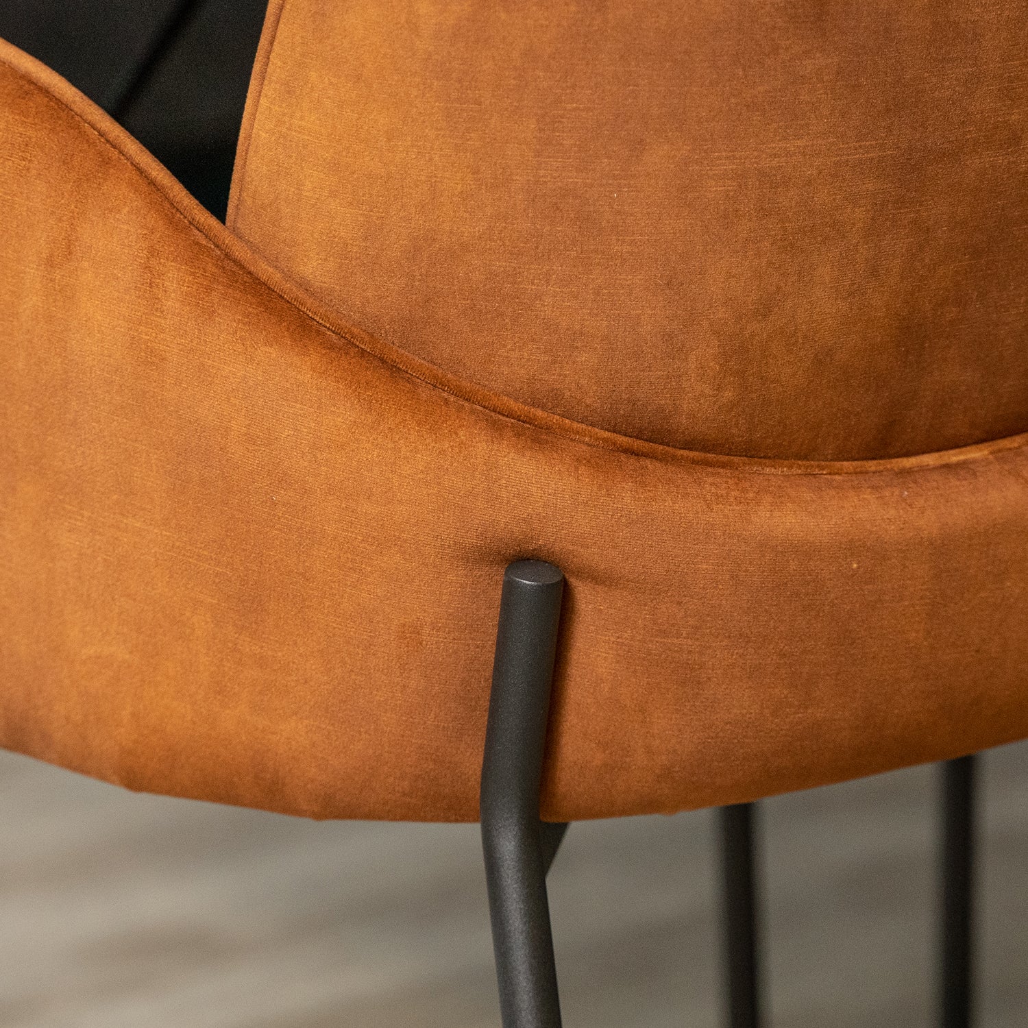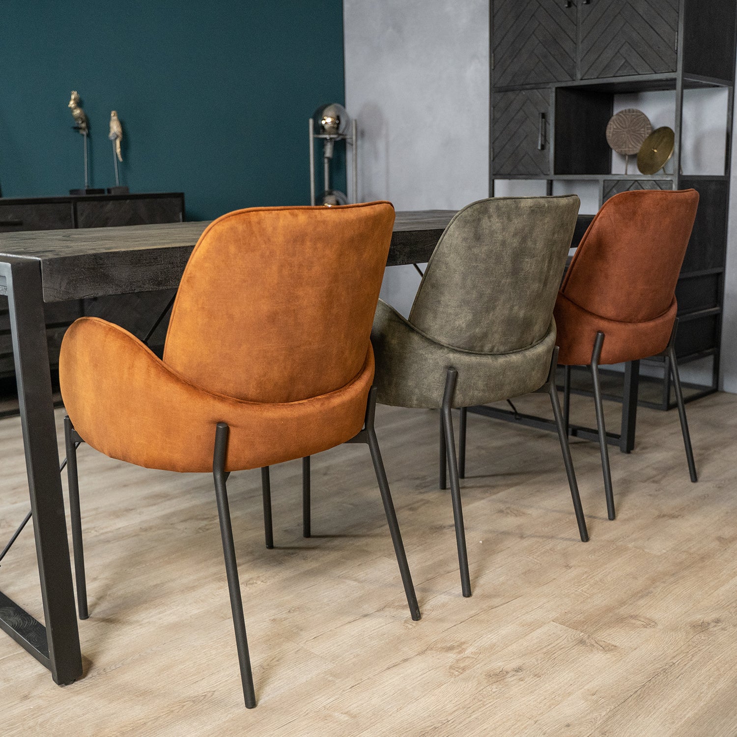 Deze velours stoel met organische vormen zorgt ervoor dat je comfortabel kunt zitten aan tafel. Het degelijke design in combinatie met het aangename materiaal stimuleert een optimale zitpositie. De achterste metalen poten lopen schuin naar buiten waardoor de stoel stevig staat.
