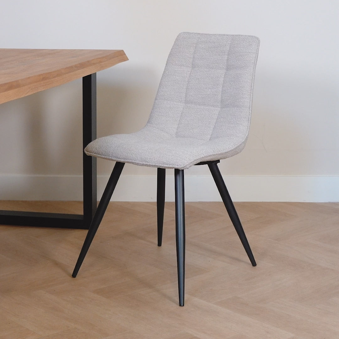 Eetkamerstoel Jelt is een prachtige stoel gemaakt van bouclé, waar comfort en verfijning samenkomen. Het prachtige blokstiksels in combinatie met het 3D effect door de dikke vulling zorgen voor een unieke en prachtige look.