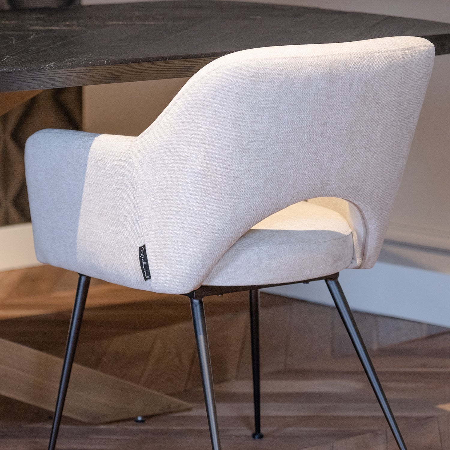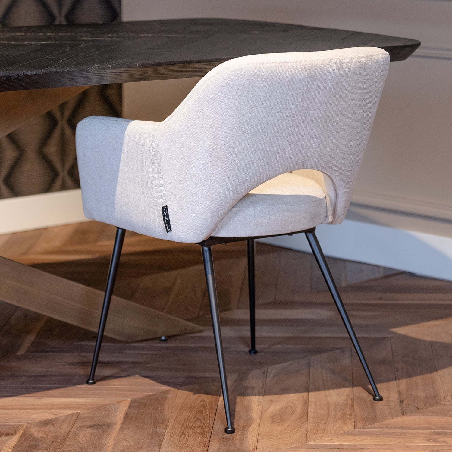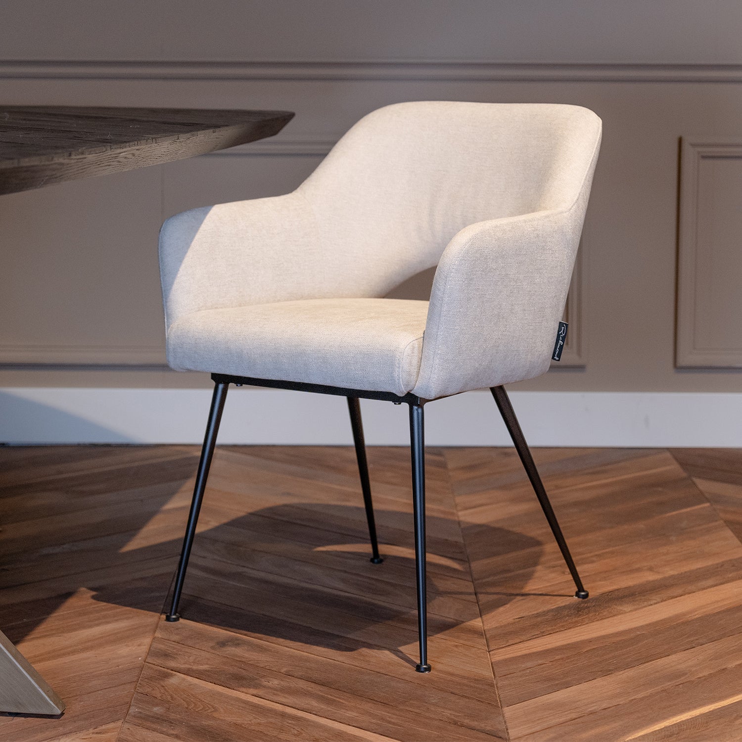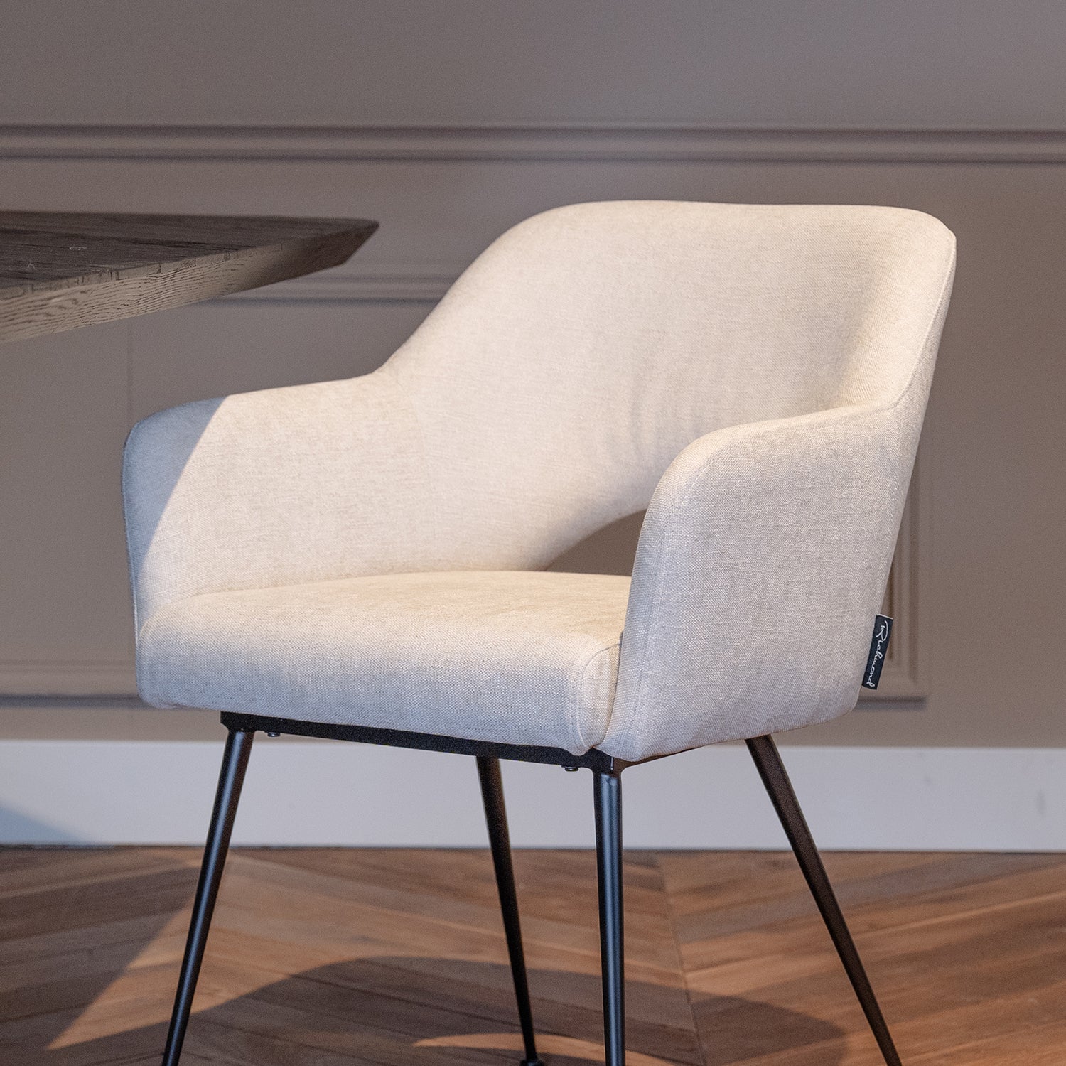 De Eetkamerstoel Jenthe in naturel is gestoffeerd met een fijne stof en heeft poten van metaal. De eetkamerstoel heeft armleuningen voor een comfortabele zitting. Check alle eetkamerstoel van het merk Richmond.