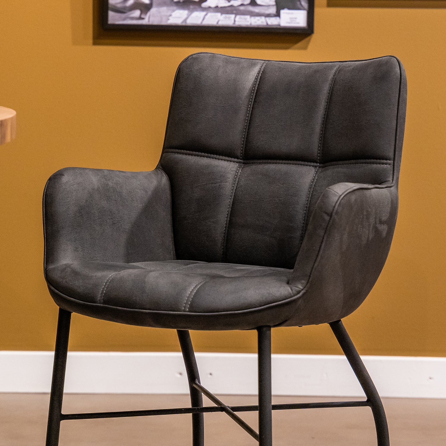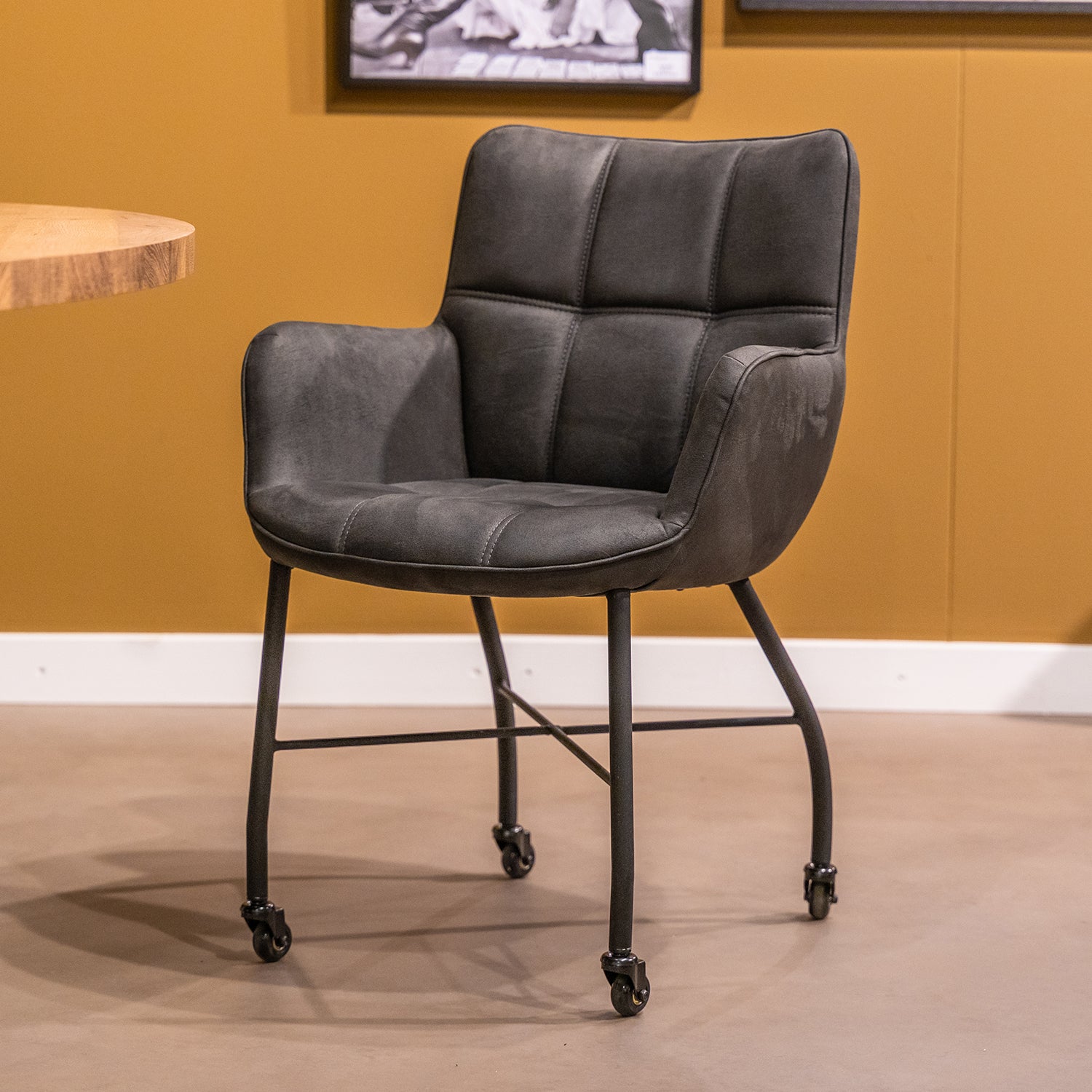 Eetkamerstoel Maud heeft een eigentijdse uitstraling door het prachtige ruitpatroon op de rugleuning en zitting. Dit geeft de de eetkamerstoel een luxe en strakke uitstraling. Deze uitstraling ontstaat ook door het prachtige zwarte onderstel. Het onderstel bestaat uit 4 zwart metalen poten en nog een kruis in het midden voor extra ondersteuning. Dit biedt comfort en stevigheid. Verder is deze zeer eenvoudig verrijdbaar met de skatewielen.