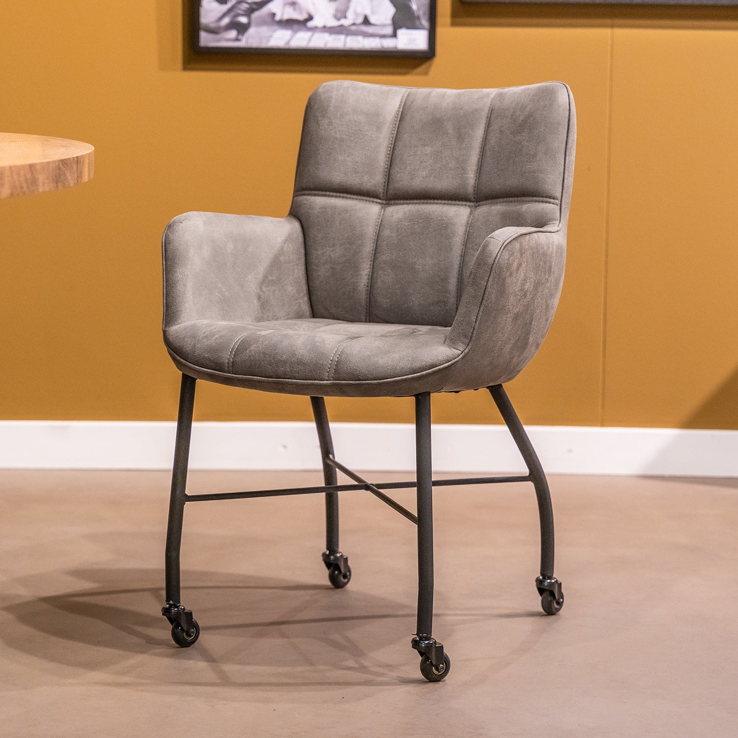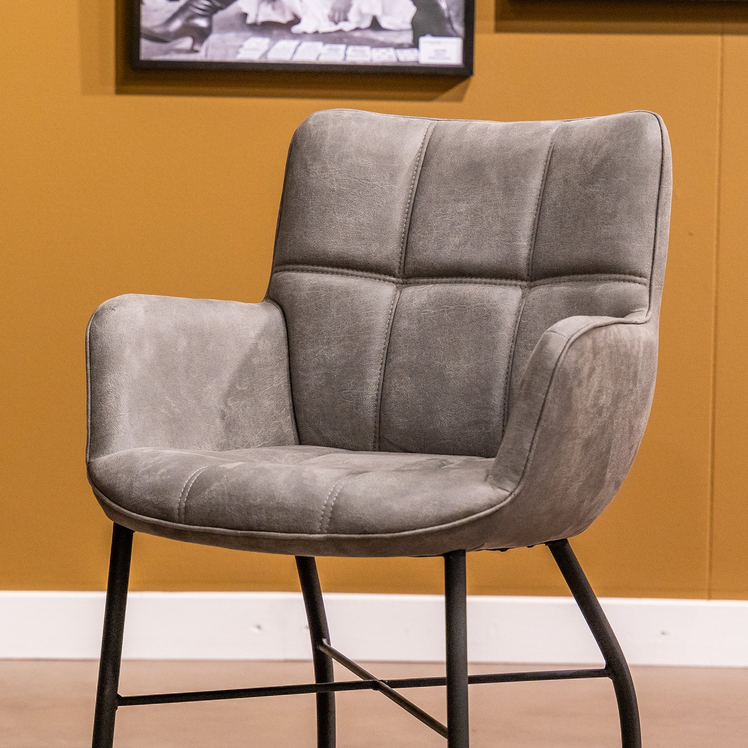 Eetkamerstoel Maud heeft een eigentijdse uitstraling door het prachtige ruitpatroon op de rugleuning en zitting. Dit geeft de de eetkamerstoel een luxe en strakke uitstraling. Deze uitstraling ontstaat ook door het prachtige zwarte onderstel. Het onderstel bestaat uit 4 zwart metalen poten en nog een kruis in het midden voor extra ondersteuning. Dit biedt comfort en stevigheid. Verder is deze zeer eenvoudig verrijdbaar met de skatewielen.