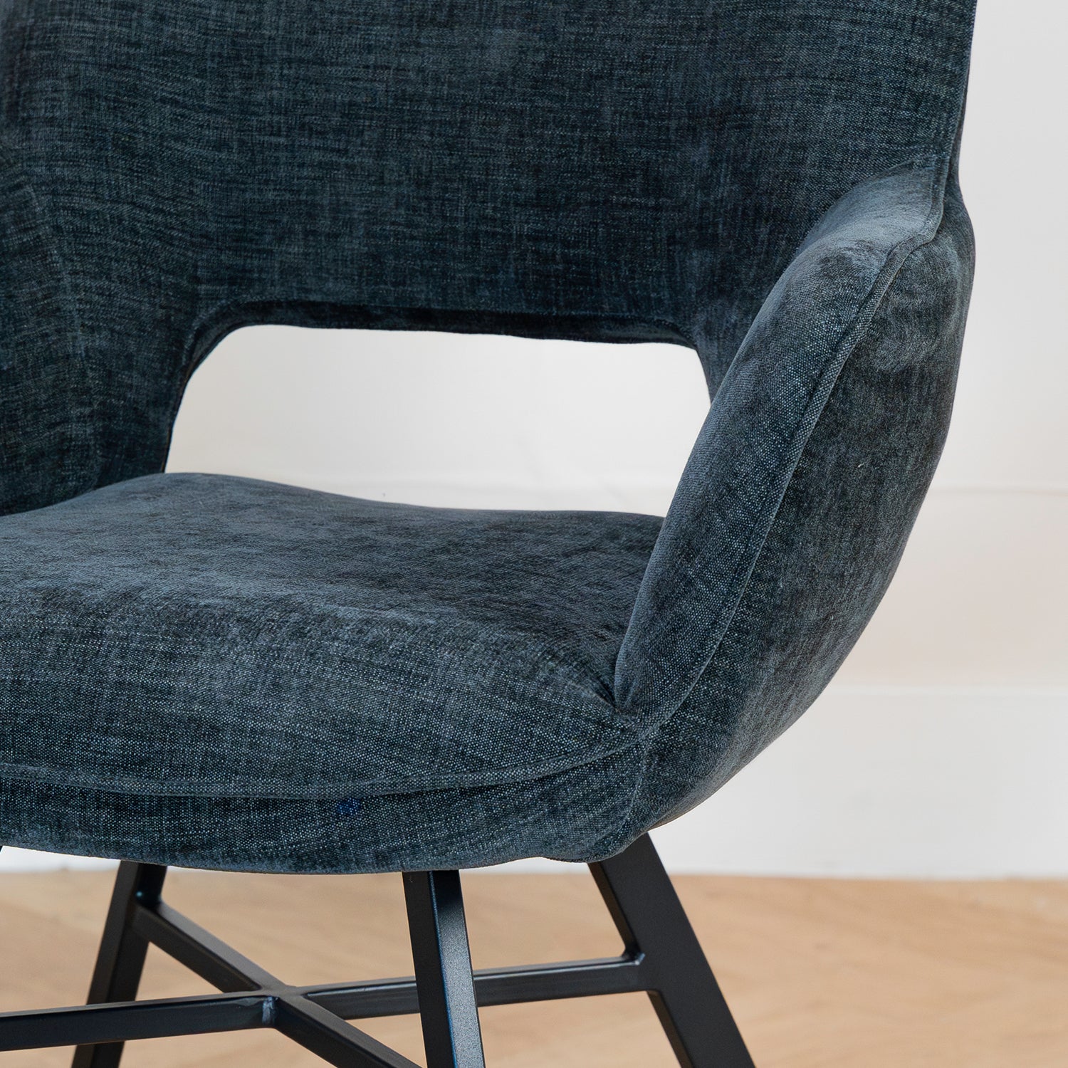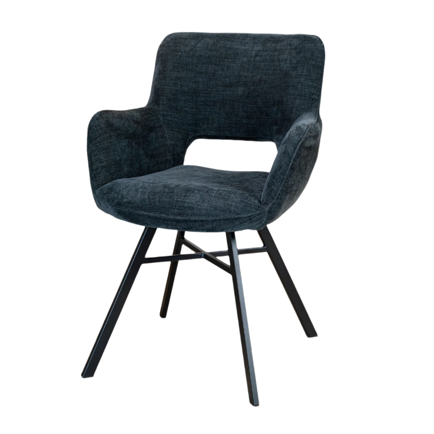 De Eetkamerstoel Mercury in de stijlvolle kleur Miami Black combineert een eigentijds design met ultiem comfort. De zachte stoffen bekleding voelt luxe aan en biedt een warme uitstraling, perfect voor elke eethoek. De subtiele rugopening en ergonomische vorm zorgen voor een luchtige en comfortabele zitervaring. Het zwarte metalen onderstel met kruispoten voegt een stoere industriële touch toe en biedt stevige stabiliteit.