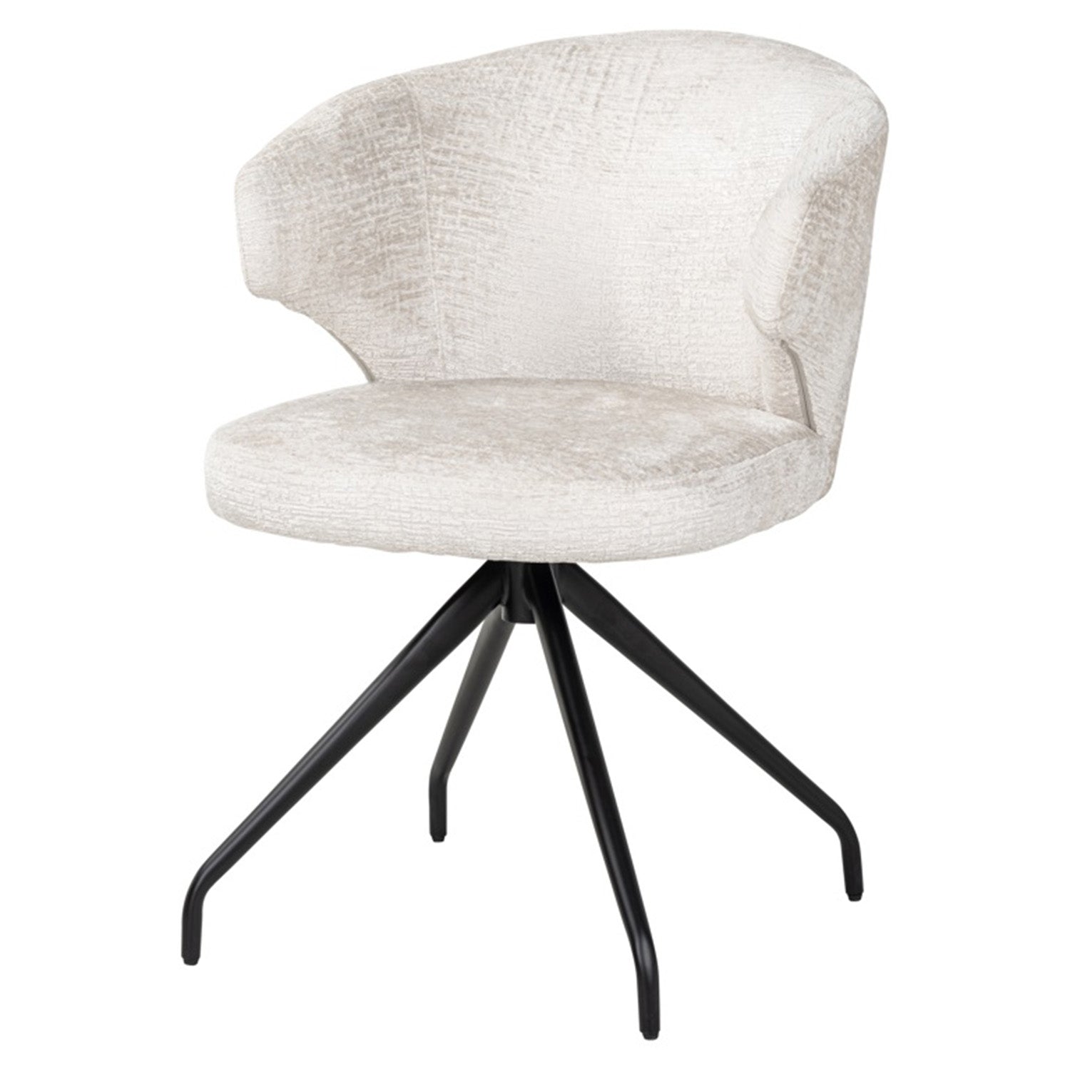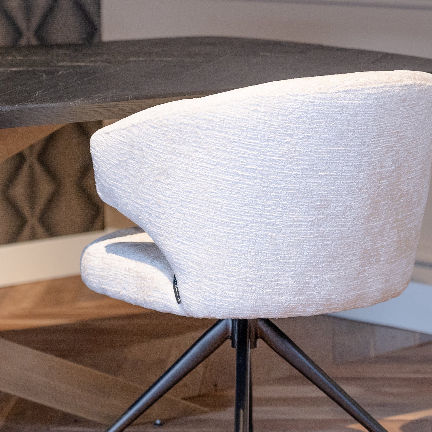 De Eetkamerstoel Milly in wit is gestoffeerd met een fijne stof en heeft poten van metaal. De eetkamerstoel heeft armleuningen voor een comfortabele zitting. Daarnaast is deze eetkamerstoel draaibaar.