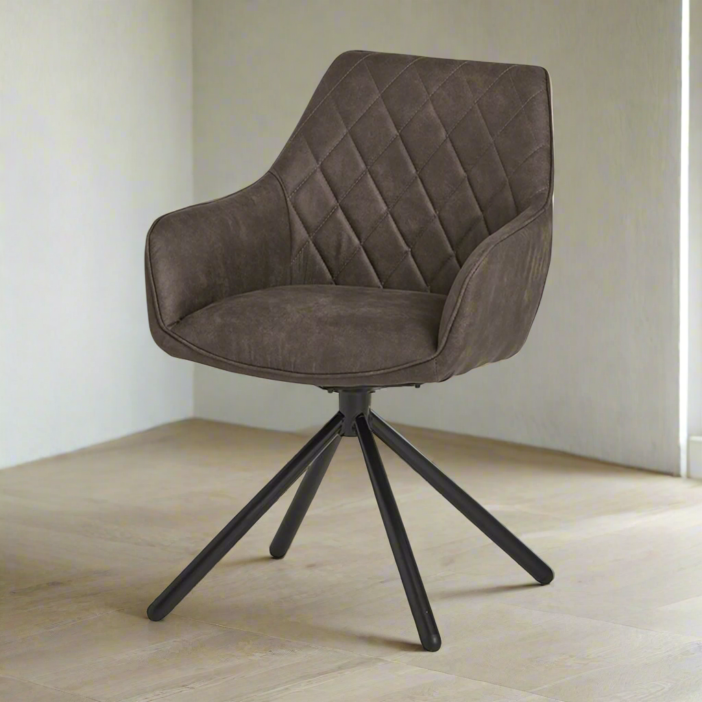 De Rebel Eetkamerstoel | Grijs Stof (draaipoot 180°) van Tower Living combineert edgy stijl met ultiem zitcomfort. De slanke, stoere stof in grijs straalt een robuuste cowboystijl uit, terwijl de zachte vulling en organische vormen een uitnodigende allure geven. Dankzij het 180° draaibare metalen onderstel zit je moeiteloos in de juiste positie, zonder de stoel te verschuiven – perfect voor dynamische eettafels of gezellige gesprekken.