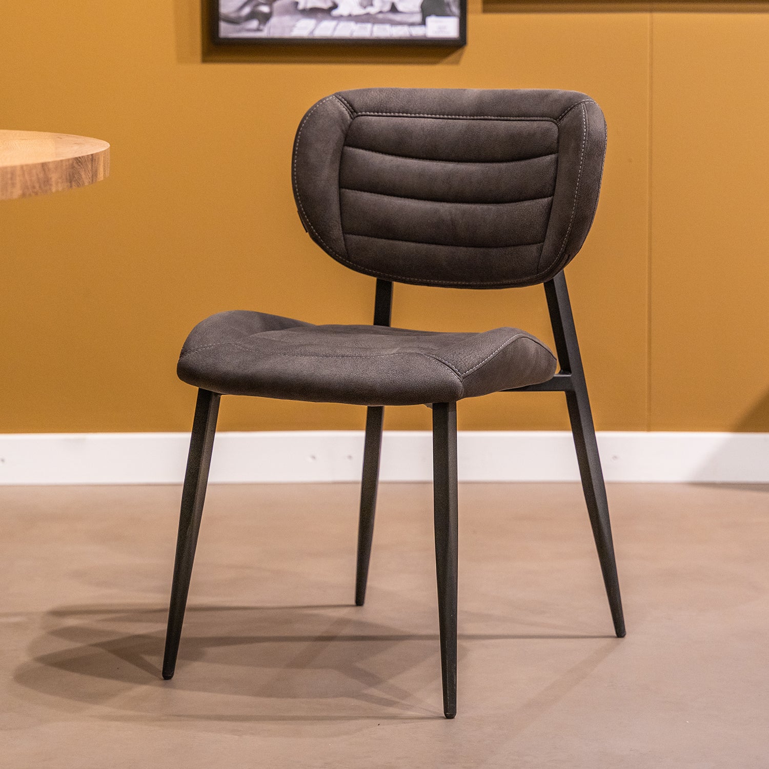 Het zwarte metalen frame bestaat uit 4 subtiele poten en loopt door tot de rugleuning. Dit biedt extra stevigheid. Bij de rugleuning kan je het frame ook vast pakken om de stoel makkelijk te verschuiven.