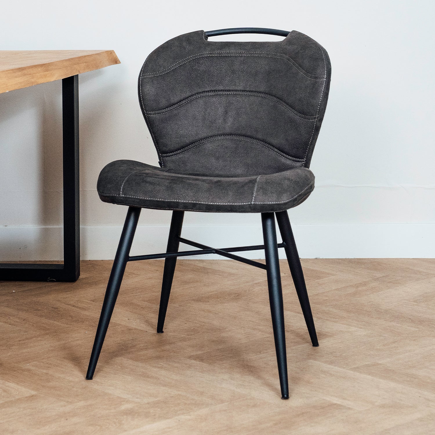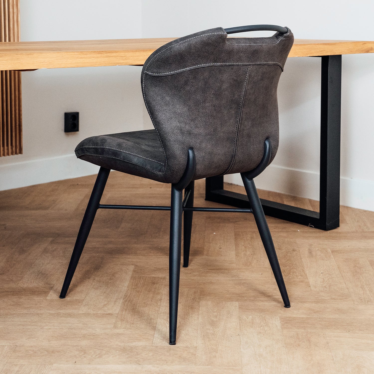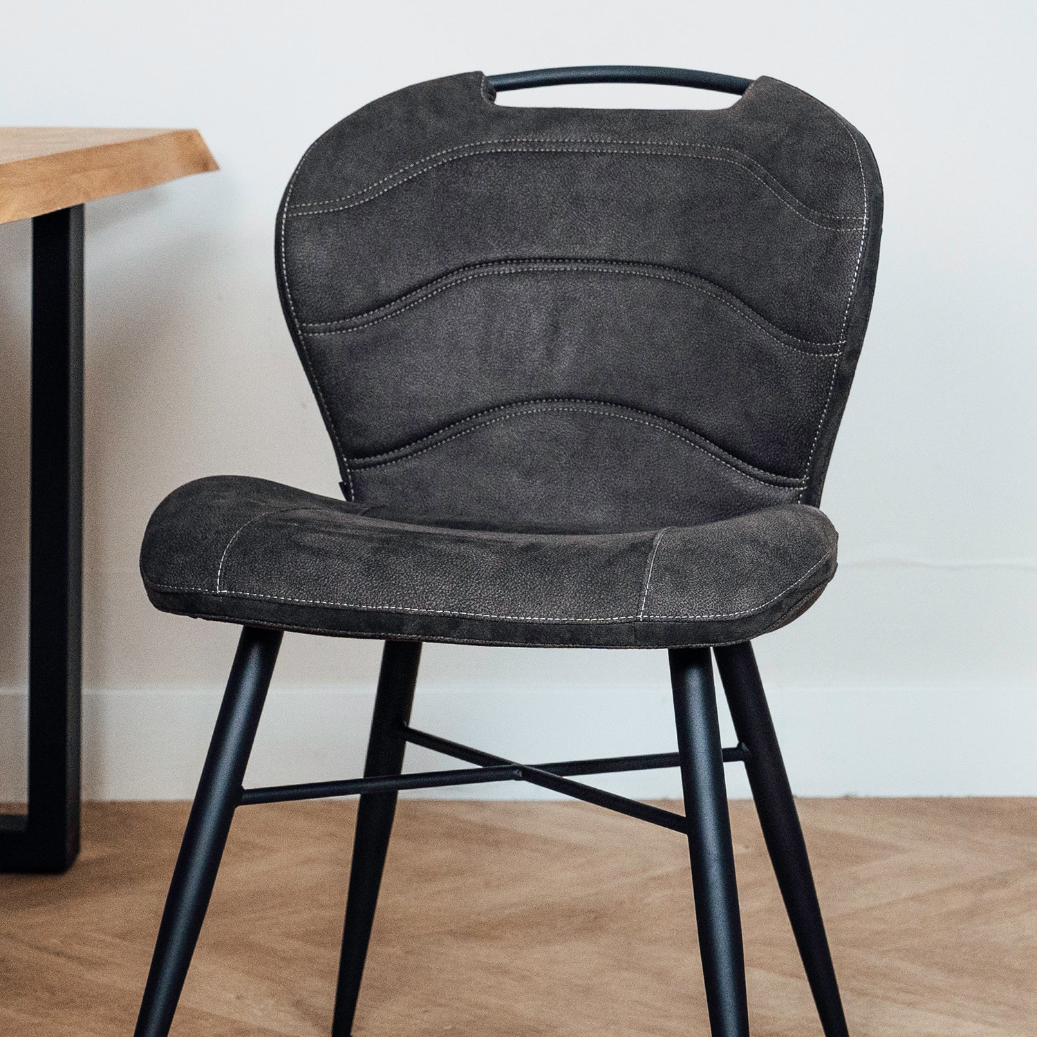 - Stevig metalen onderstel: Het zwarte metalen frame geeft de stoel een moderne en industriële uitstraling en zorgt voor een stabiele basis.