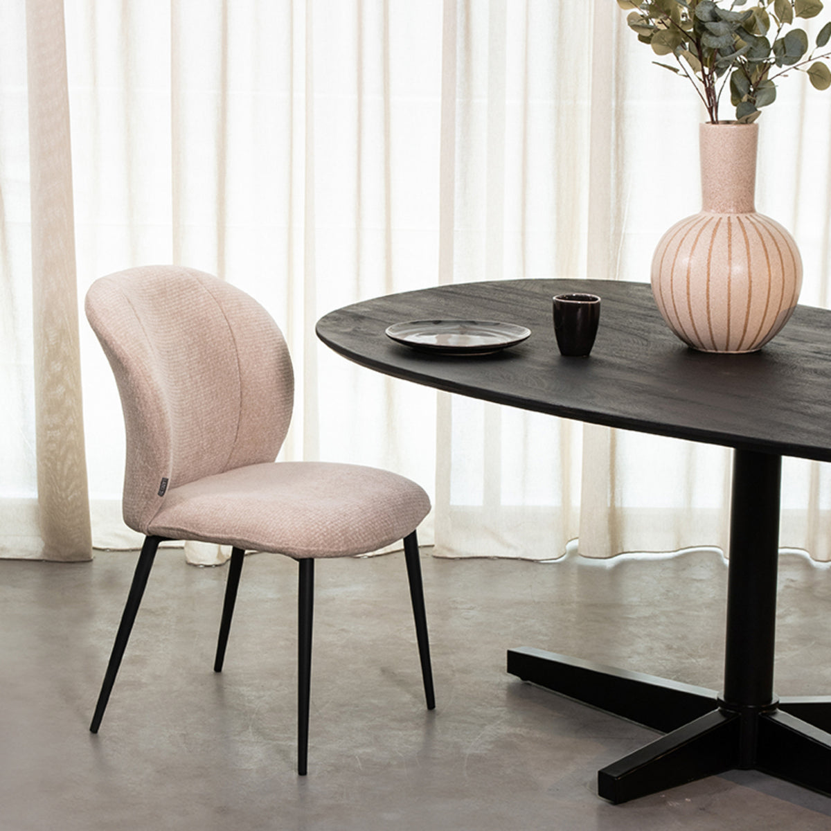 De eetkamerstoel Vino in de stof Elite combineert elegantie met een modern industrieel design. De hoogwaardige Elite-bekleding, met zijn fluweelzachte textuur en luxueuze uitstraling, tilt elke eetkamer naar een hoger niveau. De rijke kleur van de stof vormt een perfect contrast met het minimalistische frame van zwart gepoedercoat metaal, wat zorgt voor een tijdloze look.