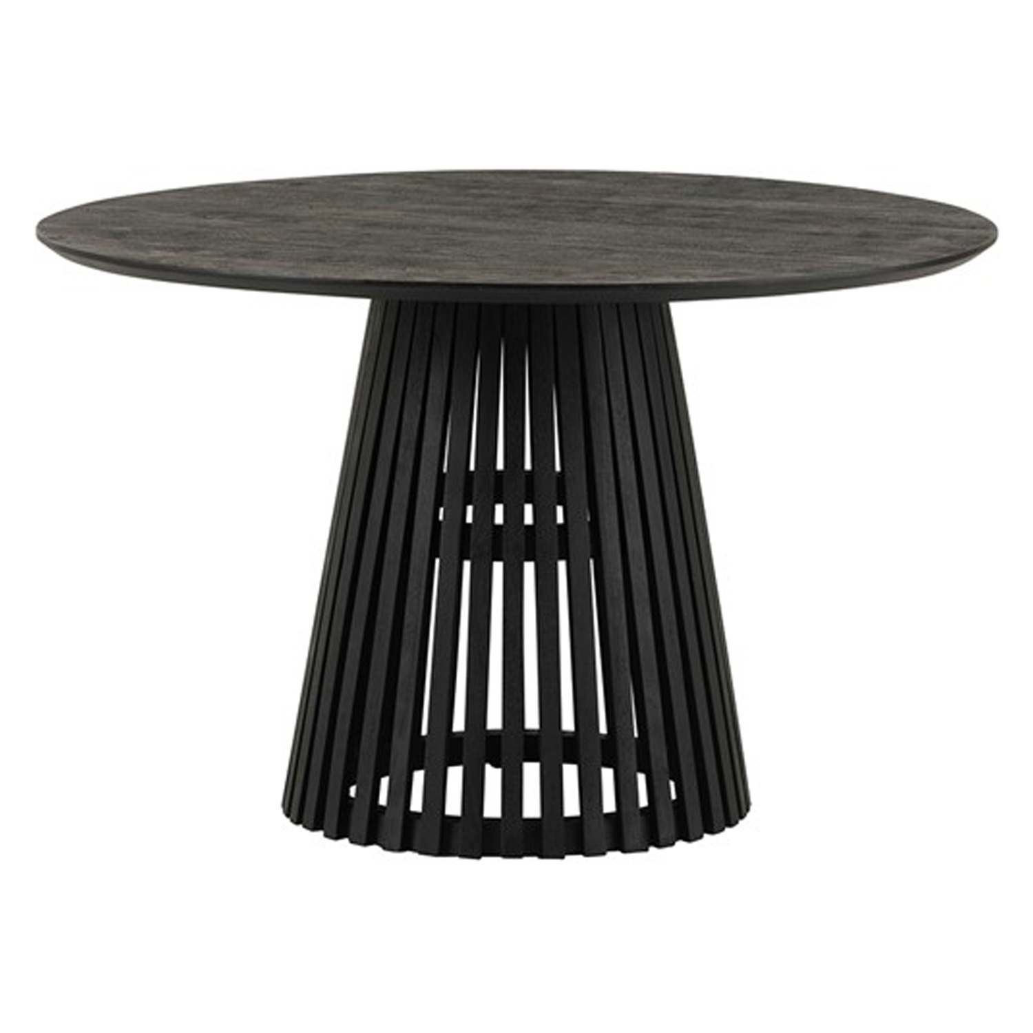 Burundi in Zwart Acaciahout. Deze ronde eettafel is een prachtig en unieke meubelstuk gemaakt van Acaciahout. De onderkant is vervaardigd uit houten latten wat een bijzondere en unieke uitstraling geeft. Het blad is geconstrueerd uit verschillende houten planken, waaronder elke eetkamertafel een eigen unieke look heeft. Deze tafel geeft net dat stukje extra aan je woonkamer.